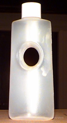 Translucent baby bottle with a hole in the middle for the baby to put its fingers through and a white cap on top. The bottom says "BP-579" and has a "1" to the right of that and a "0" below that "1".Collection