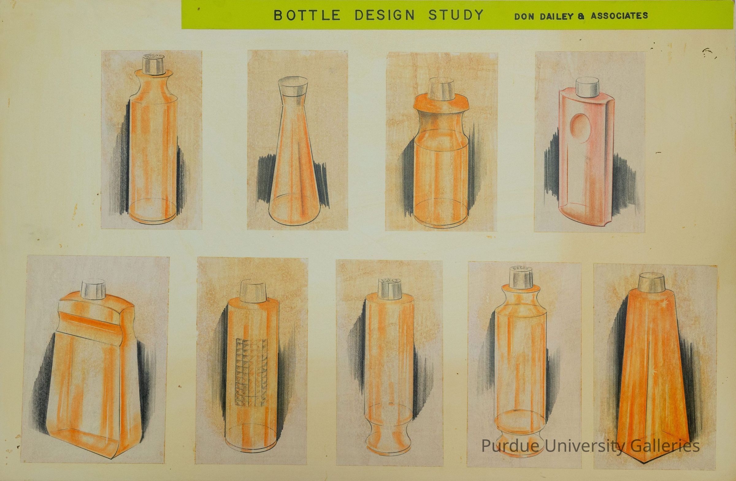 Translucent light-yellow bottle prototype. It has a pitcher shaped mouth with a lip. There are long indentations along the thinner sides. There is a tan sticker framed with a golden sticker on each of the wider sides. The smaller of the two stickers is placed in the middle of a round indentation. "15 oz DISP" is scratched onto the bottom.Collection