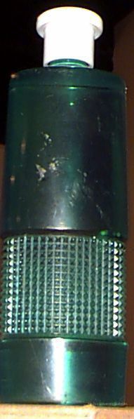 Translucent green, dense plastic, shampoo bottle prototype. The round, white cap has a golden sticker in the middle of the top. Under the cap, the top says "PX12700". The bottom has a fading "FINAL" written in marker.Collection