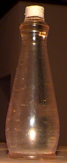 Almost transparent, thick and dense plastic model of a baby bottle. It has an indentation for a grip of some sort. It has tape wrapped around the top where a cap might go.Collection