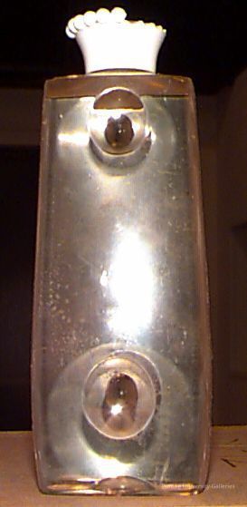 Transparent thick plastic shampoo bottle prototype. Two round indentations are present on each of its four sides and on its bottom. The white cap has a golden sticker of a "G" with plant, flower, and butterfly designs on top. It has 6 small white balls on the edge of the cap and indentations around the rest of it where other balls must have been.Collection