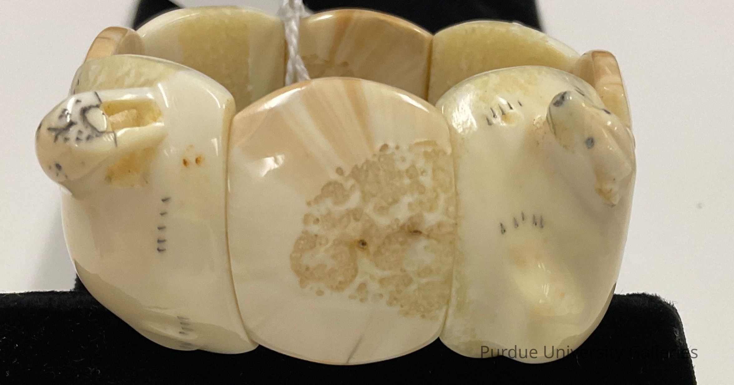 Walrus ivory with 2 rubber elastic threads running between each section to give it stretch over hand; every other section is a carved animal alternating seal, polar bear, walrus with each separated by a rectangular ivory piece