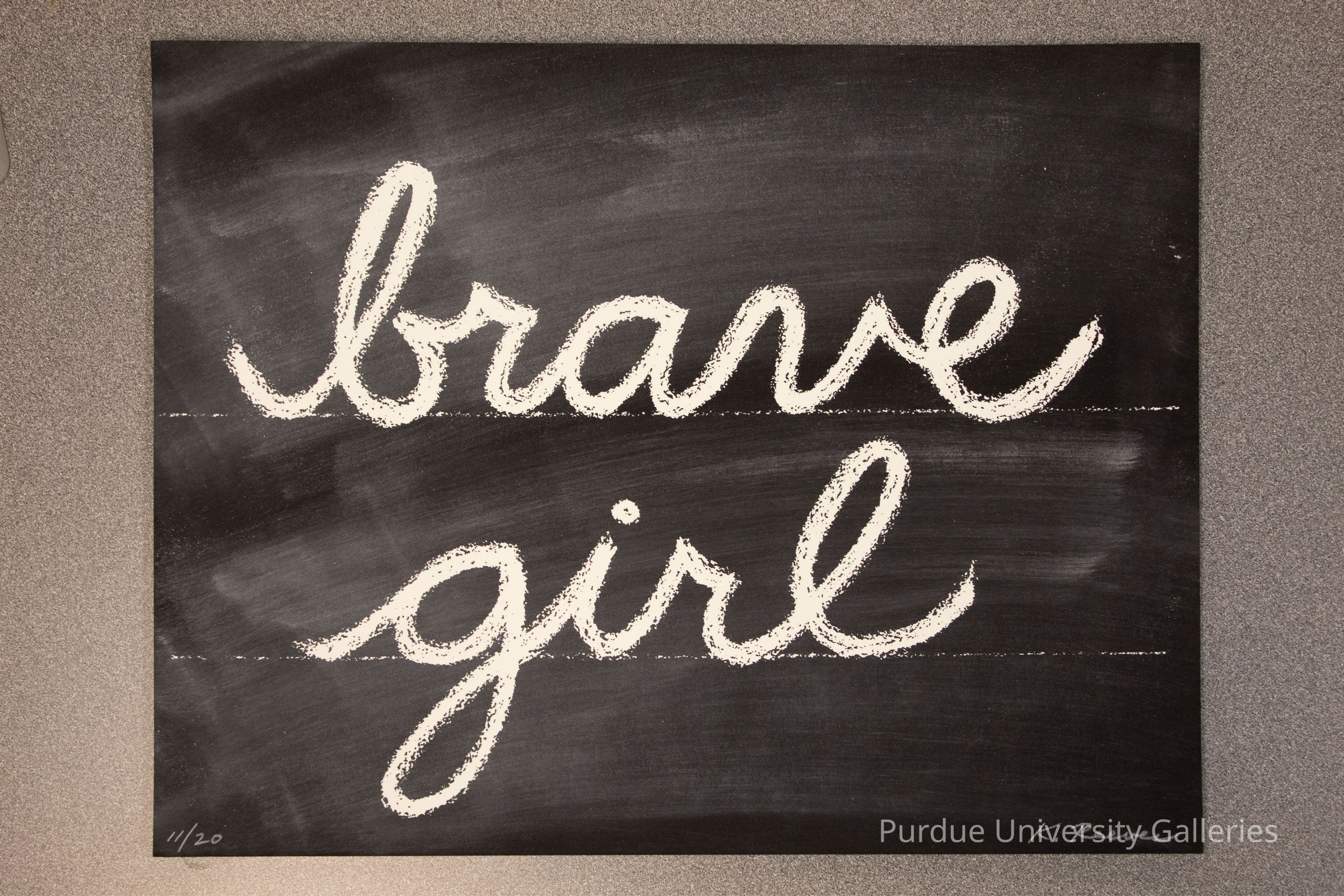 Print on cardstock with the words "brave girl" in cursive and on top of one another. The background resembles a school blackboard. At the bottom left corner printed in pencil "11/20," and in bottom right corner printed in pencil "K. Reeves." On reverse side printed in pencil bottom right corner "kathrynreeves@yahoo.com