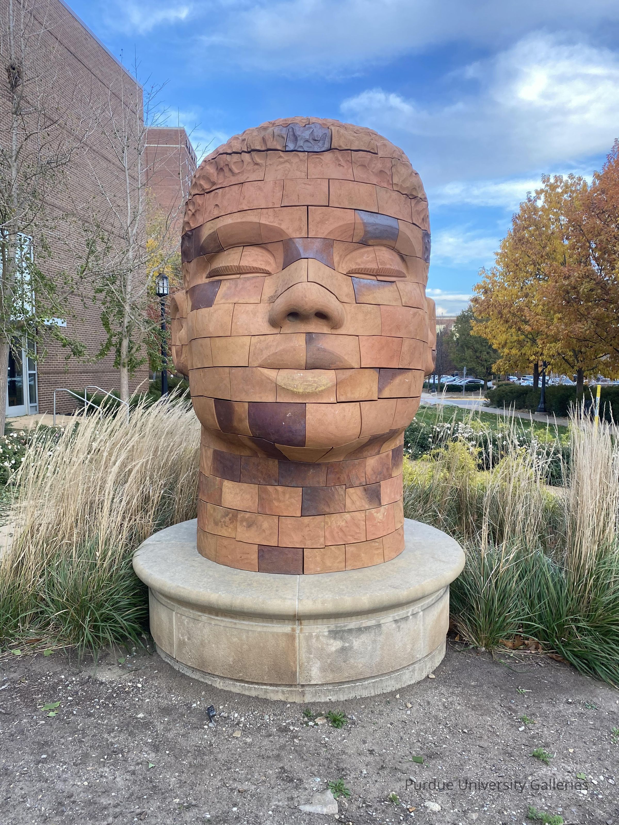 This piece stands at the outside of PAO hall. It represents a face made from brick and carved and placed to see the whole picture. Inside the piece there is an audio playing of bird calls that has importance to the piece. Not only does it create ambiance, but it has the intention in mind that birds will stray away from the piece. It is made to ward off any birds due to the audio that plays consistently throughout the day. The piece stands a bit taller than the average person. It is a defining feature of PAO. At the bottom stands a circulate base made of stone. Two sit outside the building outside a courtyard that leads into the main entrance of the building.Type of Sculpture