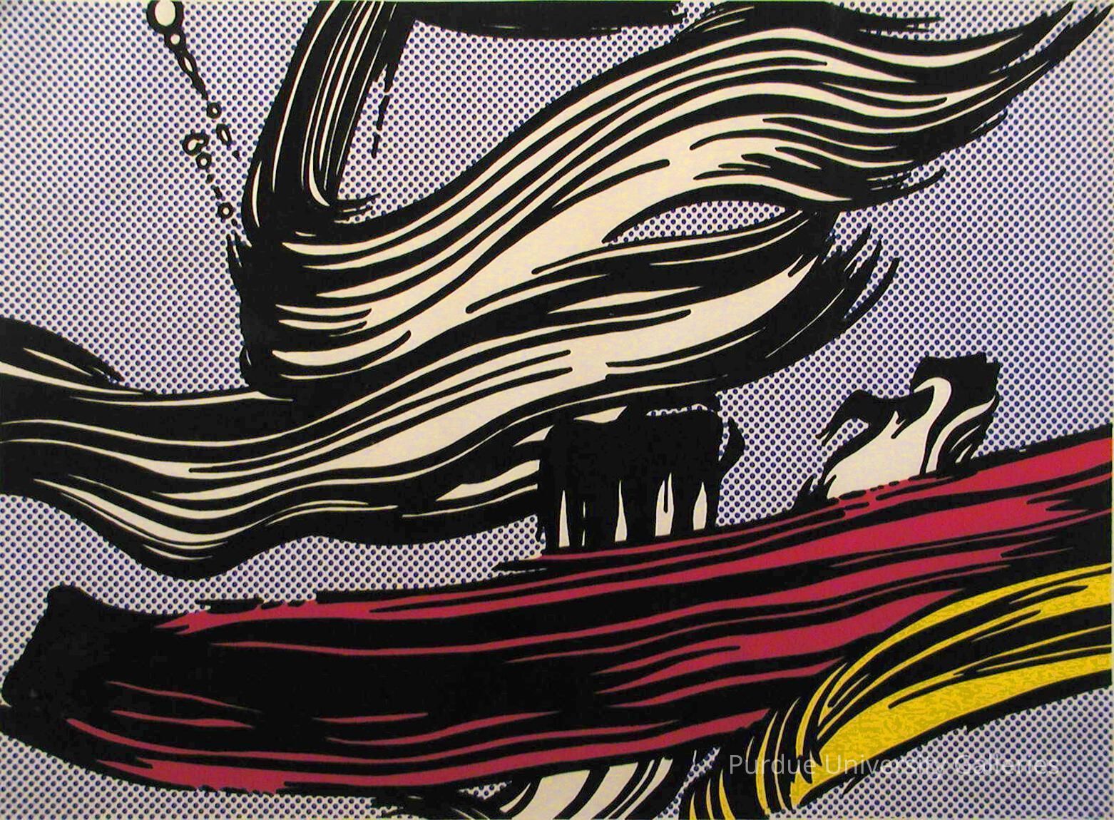 "Along with fellow Pop artists Andy Warhol, James Rosenquist, Red Grooms, Claus Oldenburg and others Lichtenstein defined and dominated the American an scene during the early and mid 1960s. In his works, Lichtenstein chooses action-charged images which, in the early stages, he took from melodramatic color comic strips. His distinctive style, which utilizes enlarged Ben Day screen dots, makes the actual process of print reproduction into the subject matter of his work. His predominant color range -- black, red. yellow and blue -- also suggests commercialism by imitating printers ink colors. Strong black outlines around his images further the graphic, 'reproduced"" look of Lichtenstein‘s art.