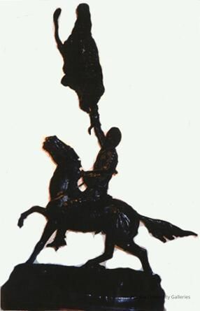 "Remington had such success with his first version of The Bronco Buster that he decided to produce a second one half again as large as the first. He wrote to Bertelli at the Roman Bronze Works that “this size lends itself to my hand much better than the smaller.”1 When the model was finished he sent off an enthusiastic note to the foundry. ""Say Bertelli, you ought to see the 11/2 Bronco Buster -- It will make your eyes hang out on your shirt. Get ready to retire the small one -- mind you.""2 1 Letter from Remington to Riccardo Bertelli, undated (1909), in the collection of the R. W. Norton Art Gallery, Shreveport, Louisiana. 2 Letter from Remington to Riccardo Bertelli, undated (1909), in the collection of the R. W. Norton Art Gallery, Shreveport, Louisiana. ------ 1999.13.01 & 1999.13.09 Frederic Remington was defined by the Old West. His obsession with the lives of countless Native Americans, cowboys, and military men drove him to attempt to recreate with vivid details the drama and danger of their daily life. Not surprisingly, he focused on equestrian due to their inherent danger and beauty. Several of his bronze sculptures represent horses and horsemanship in their finest details. Remington enjoyed great success despite the fact that he had very little formal training in sculpture. He extended the possibilities of what bronzes can show as demonstrated by The Outlaw: the artist relished the challenge of pushing boundaries. He wrote to the head of the Roman Bronze Works, Riccardo Bertelli, a post card with a sketch of a bucking horse and rider and under he wrote this conversation, “R: ‘Can you caste him?’ B: ‘Do you think I am one of the Wright brothers?’” Remington took a realistic view in The Outlaw. The cowboy sits leaning backward precariously on his steed struggling to maintain his balance and control, as his steed rears right into the curve. The riders face is frozen in a determined and confident expression, while in contrast the horse is frantic with energy and terror. The arching lines of the sculpture convey the excitement of the action, with the cowboy twisted in his saddle. We have the illusion that the bronze is alive and simply frozen at the peak of drama. Frederic Remington used realism extensively throughout his bronzes. The textures and details of the rider and horse are painstakingly depicted by Remington. He wanted to bring his idea of the Old West to the modern world of the East Coast. Like most of his other works, The Outlaw demonstrates Remington’s careful attention to the anatomy horse movement and the riders mastery over them. Frederic Remington created The Outlaw as a companion pieces to the The Broncho Buster. They are like a teeter-totter, creating a fluid flow from the start to finish of the horses bucking motion. Bibliography: Remington1960: [PAGE #s]; Hassrick 1973: [PAGE #s] ; Shapiro1981: [PAGE #s]; Hassrick 1988: [PAGE #s]; Remington 1993: [PAGE #s]; Nemerov1995: [PAGE #s]; “Frederic Remington (1861-1909).” http:// www.christies.com/LotFinder/lot_details.aspx?intObjectID=5154232; Amon Carter Museum, “Works of Art.” http://www.cartermuseum.org/works-of-art/1999-22 Submitted by Eric Engle"