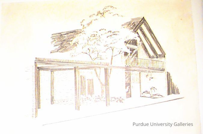 Sketch of the exterior of a building (house?). In the front of a building, there is a tree and an awning that connects to the house and is held up with supports that touch the ground.