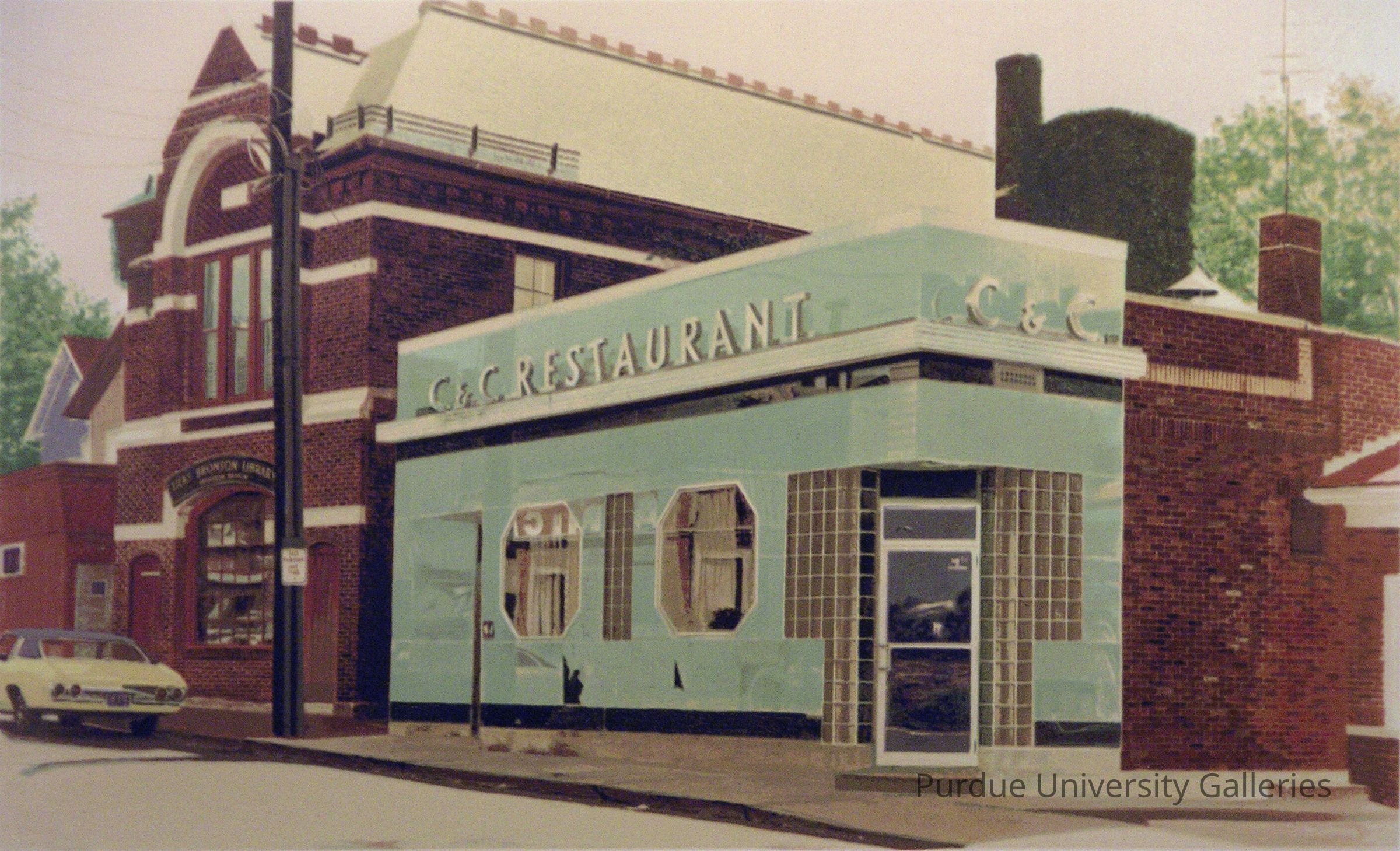 This print shows the outside scene of a location called C&C Restaurant. The serigraph is glossy, and a thick ink is visible. The piece is very detailed, and every inch of the piece has immaculate accuracy. This looks as if it almost is a photograph. The view is a little blurry based off of the texture of the serigraph itself.