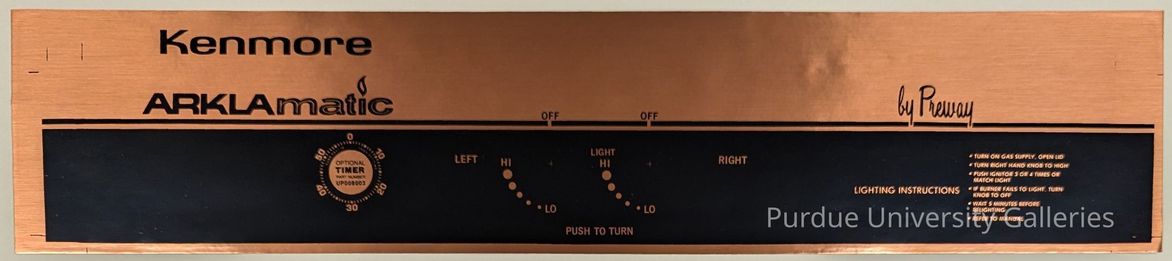 Same as 1997.03.135.02 but different colors. Kenmore ARKLAmatic appliance label. Metallic vinyl sticker. Logo and title are on left side, underneath which is a timer circle. In the middle are two temperature labels with high and low temperatures, a "push to turn" label on the bottom, and off labels above. On the right side are lighting instructions and the words "by Preway" written in cursive. Printing cut lines are along edges.Collection