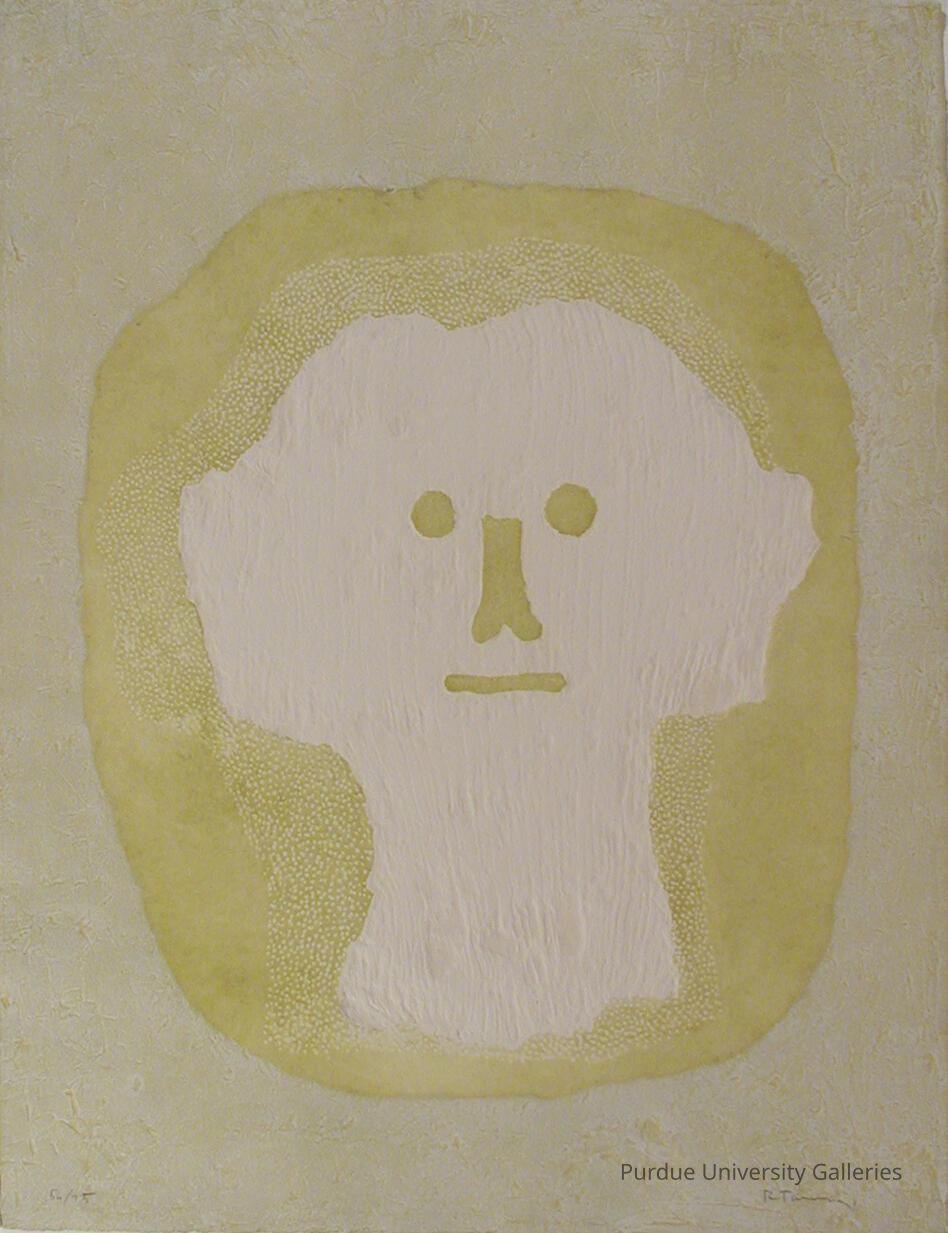 "A large-scale solitary head overwhelms the print entitled Cabeza Verde (1979). With simplified features including two circles for eyes, a stylized nose and a straight line for a mouth, the figure gazes out to viewers allowing for direct eye contact to be the first observation of this piece. The floating head is placed on top of a light green oval-like shape. The overall color scheme consists of off-white and pale green, a common trend in Tamayo’s works during the 1970’s. The use of pale colors that contrast his iconic use of deep and vibrant colors is also apparent in another of Tamayo’s Mixografia prints housed at Purdue University: Las Cabezas Blancas (1976).
