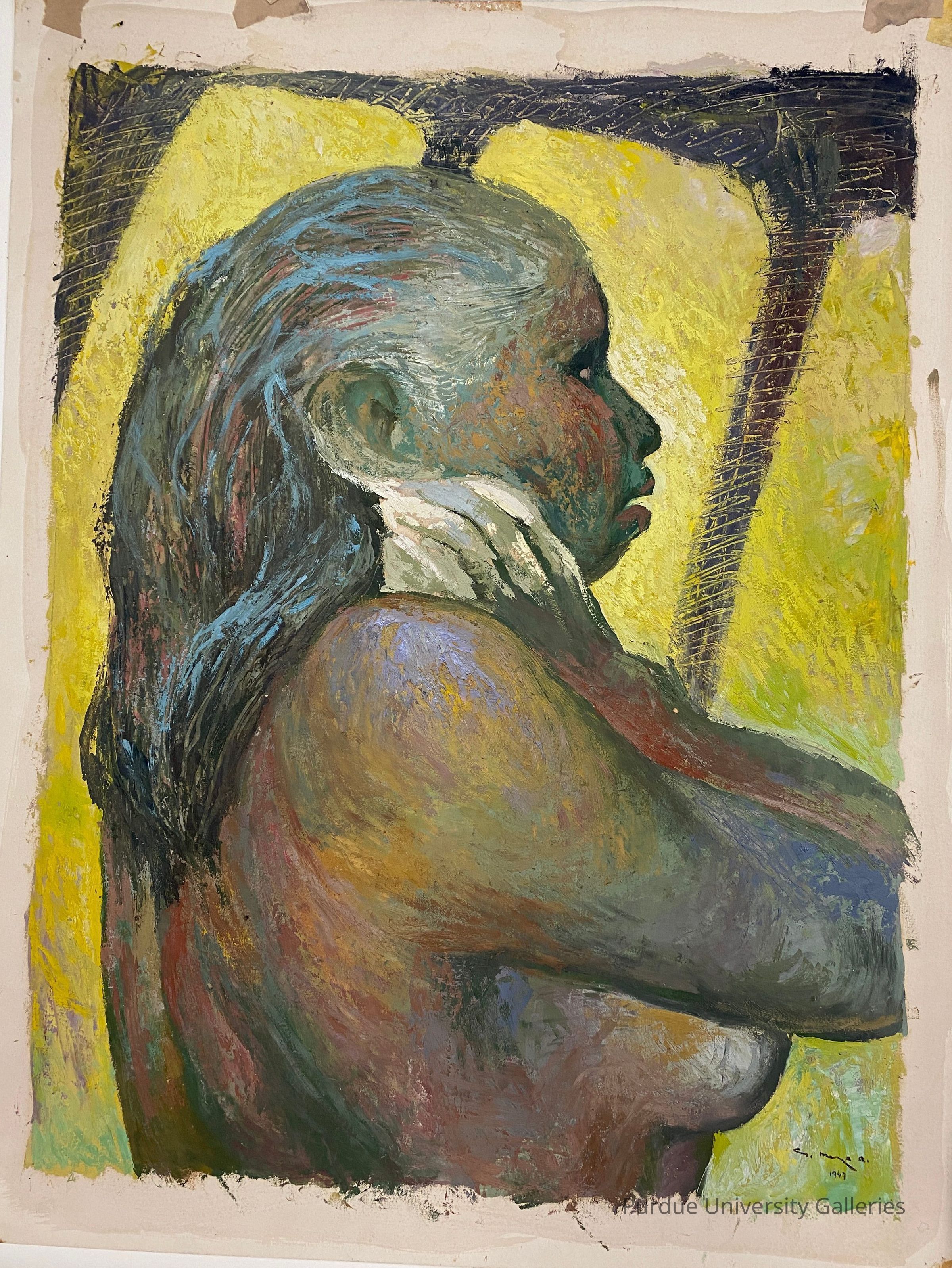 The painting is a nude portrait of the upper half of a woman. The woman is facing to the right with her right hand cupping the side of her face, also covering her breast. Her hair is dark highlighted with blues and whites. The woman's dark complexion is also highlighted with various colors such as blue, yellow, white and red. The woman is painted on a background with yellow panels with black outlining the panels.