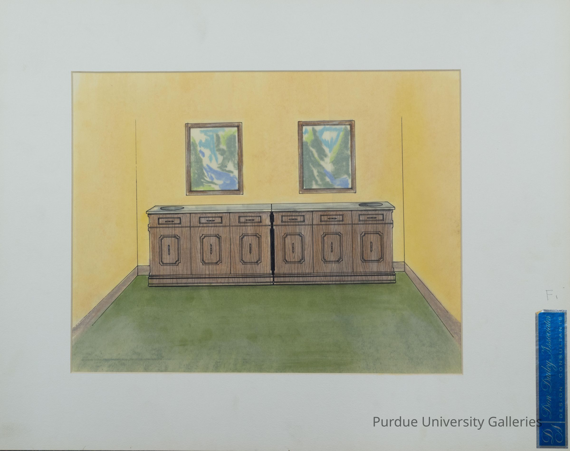 Prototype drawing of a long cabinet in a room. There are two pictures on the wall behind the cabinets. "DDA 6/30/73" is written in black on the bottom, right-hand corner of the drawing. The drawing is taped onto a white mat. "F1" is written in pencil on the right-hand side of the frame, just above a blue and silver sticker that says "Don Dailey Associates" "DESIGN CONSULTANTS".Type of Drawing