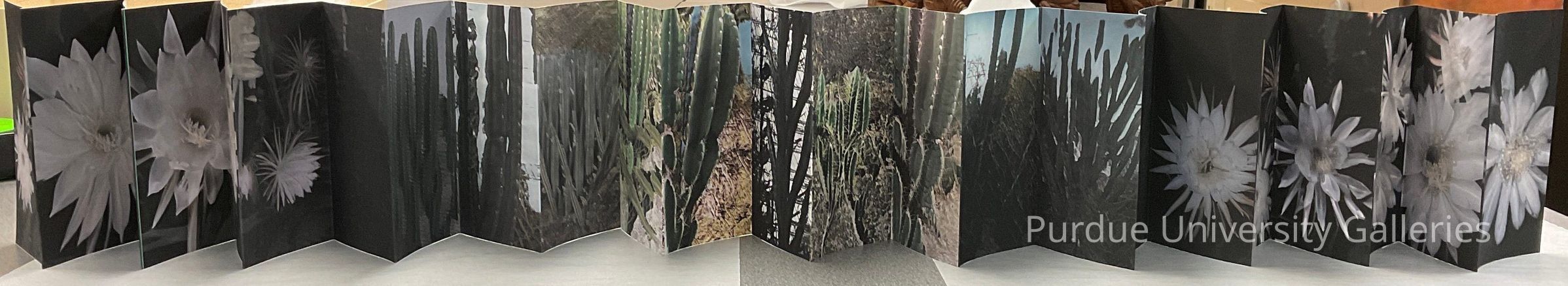 Four lengths of paper 6” H with 12 folds in it. Image is of 24 hour cycle of a cactus throughout the year. Both ends of the image are dark with the middle images being the brightest due to the noon day sun. Flowers are white.