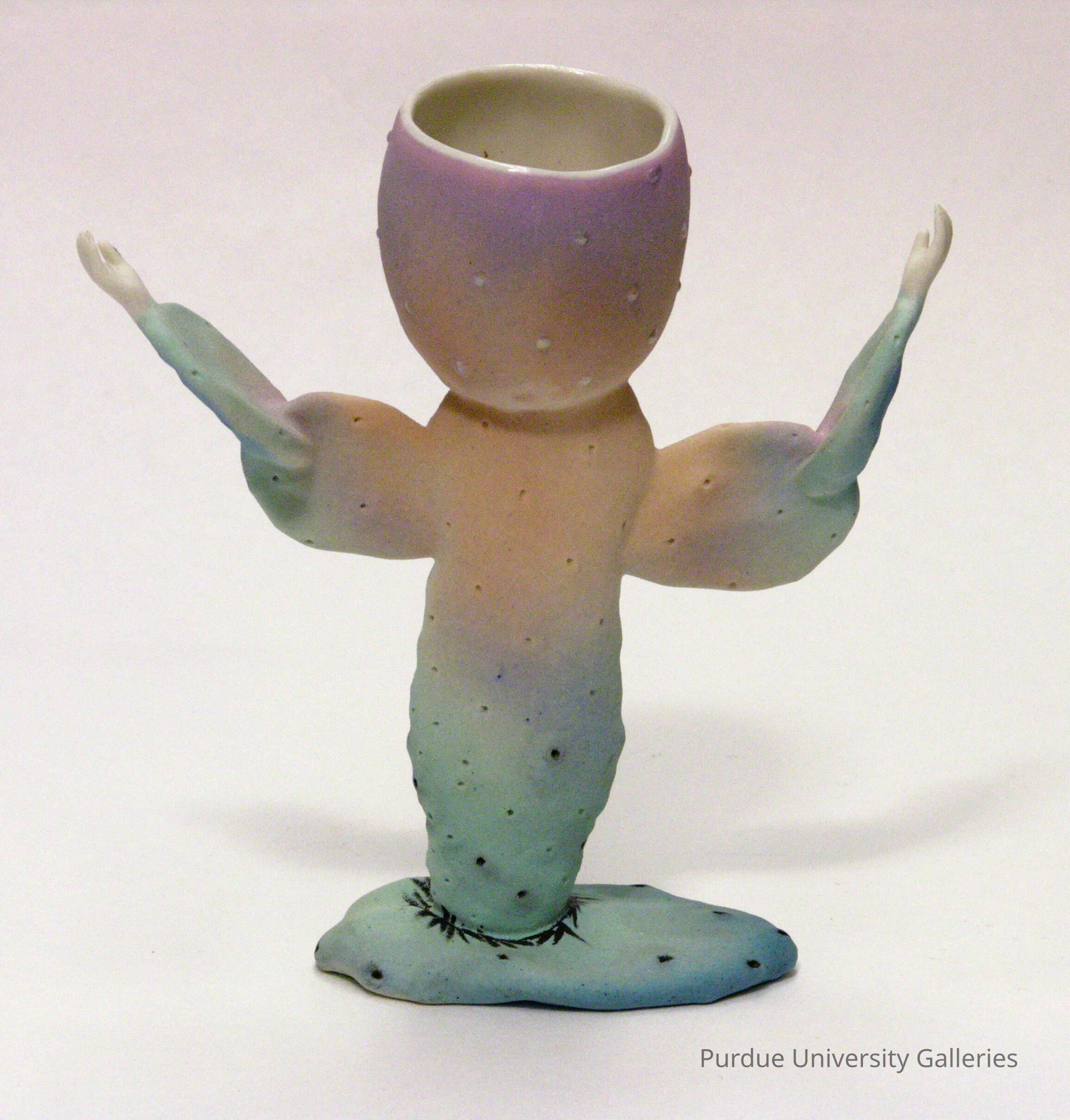 This freeform sculpture is made from clay and has a hand-built look to it. The top of the cup seems to be more equal and even as a cup would be, but the rest of the cactus looks handmade. The cactus seems similar to the silhouette of a human with its arms raised. There are arms sprouting from the sides of the cactus in the body. The base of the cactus goes into what a usual cactus would look like. The holes where the spikes would be prominent specifically at the bottom with the glaze in the ridges. The cactus seems to be covered in a spray-painted colored glaze or slip. It has a gradient from purple to pink in the body to a teal/light blue near the bottom and the arms.Type of Sculpture