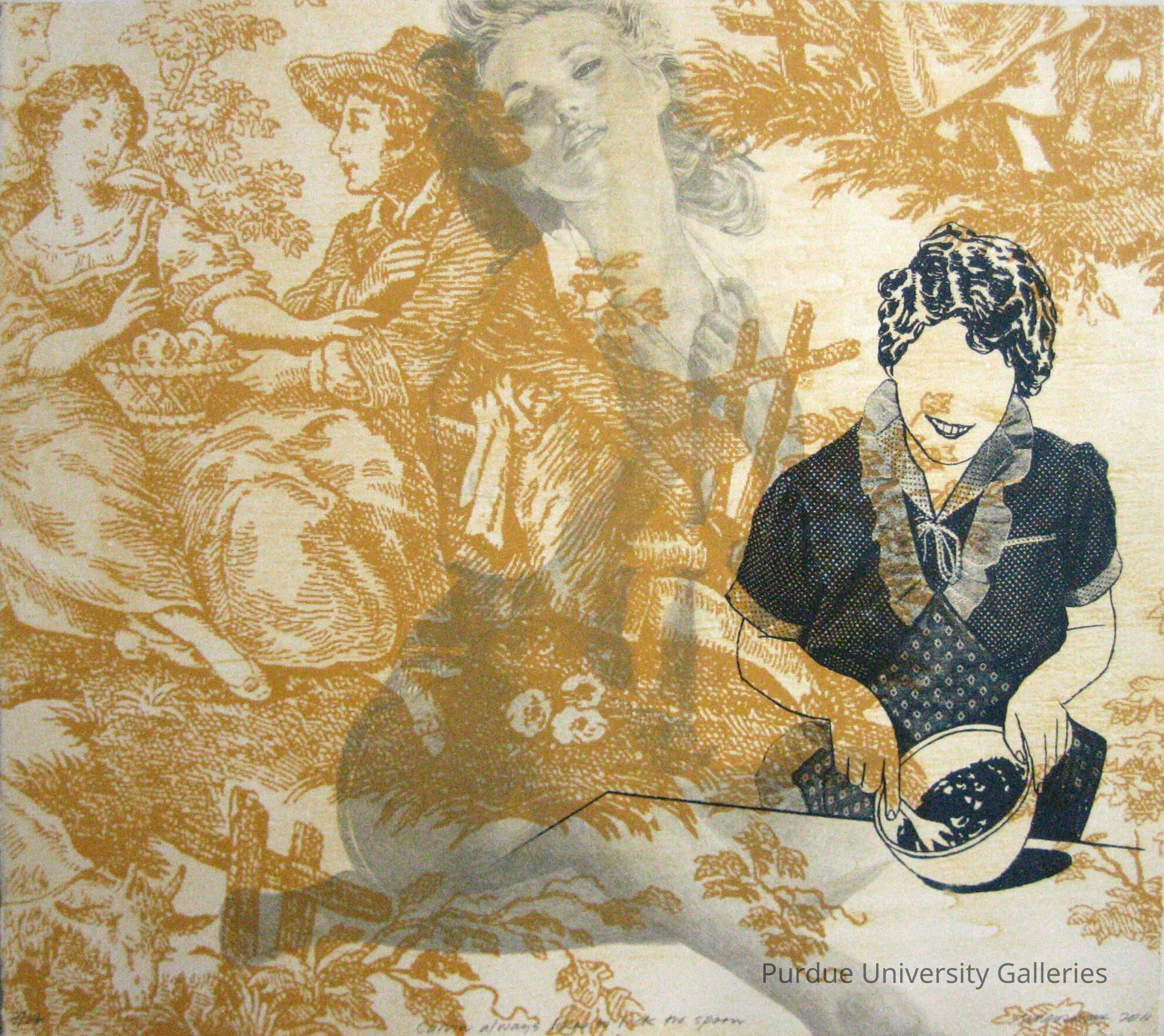 This mixed media print (photocollagraph, lithograph, silkscreen), in particular, showcases all of these appropriated source categories. My aim is to encourage information displacement and disorientation. Remixing the narrative creates new associations. Each method changes and deconstructs any hierarchy of information and both presents and confronts a new reality. Generally, my work uses actual text, taken out of context from one of my appropriated sources, as the impetus for conception of the work, and the title of the image. I hope to do this while still retaining a sense of humor.