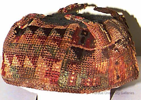 Fiber, alpaca. Four pointed pile woven cap with face and geometric motifs. Colors include red, yellow, green, and black. Patch added and top reattached.Acquisition