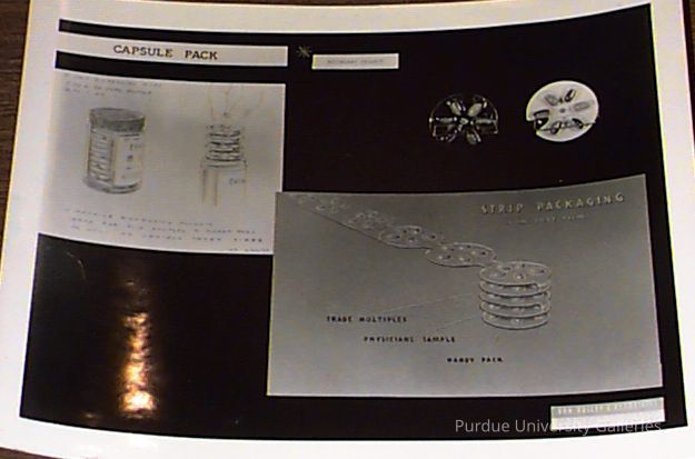 Black and white photograph of pill blister packs and prototypes of a capsule dispensing pack. "CAPSULE PACK" "* SECONDARY PROJECT" is on the top left-hand corner.