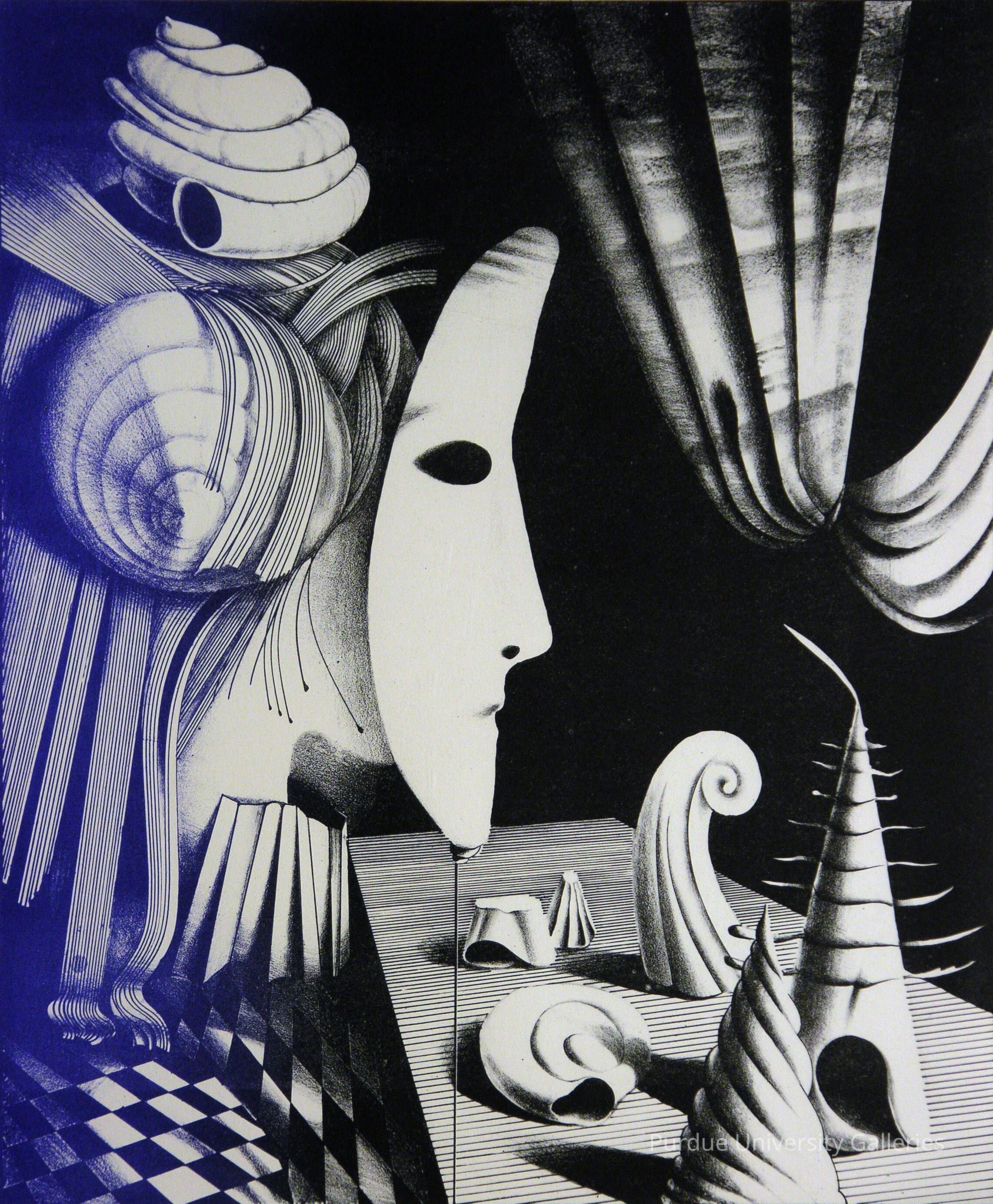 Through over forty years of practice Latvian artist Maija Dragūne has developed a visual language all her own. In her enigmatic lithographs Dragūne takes natural and folkloric forms and transmutes them through her imagination, creating strange and surreal visions of carnivals, masks, musicians, shells, birds, and fish.