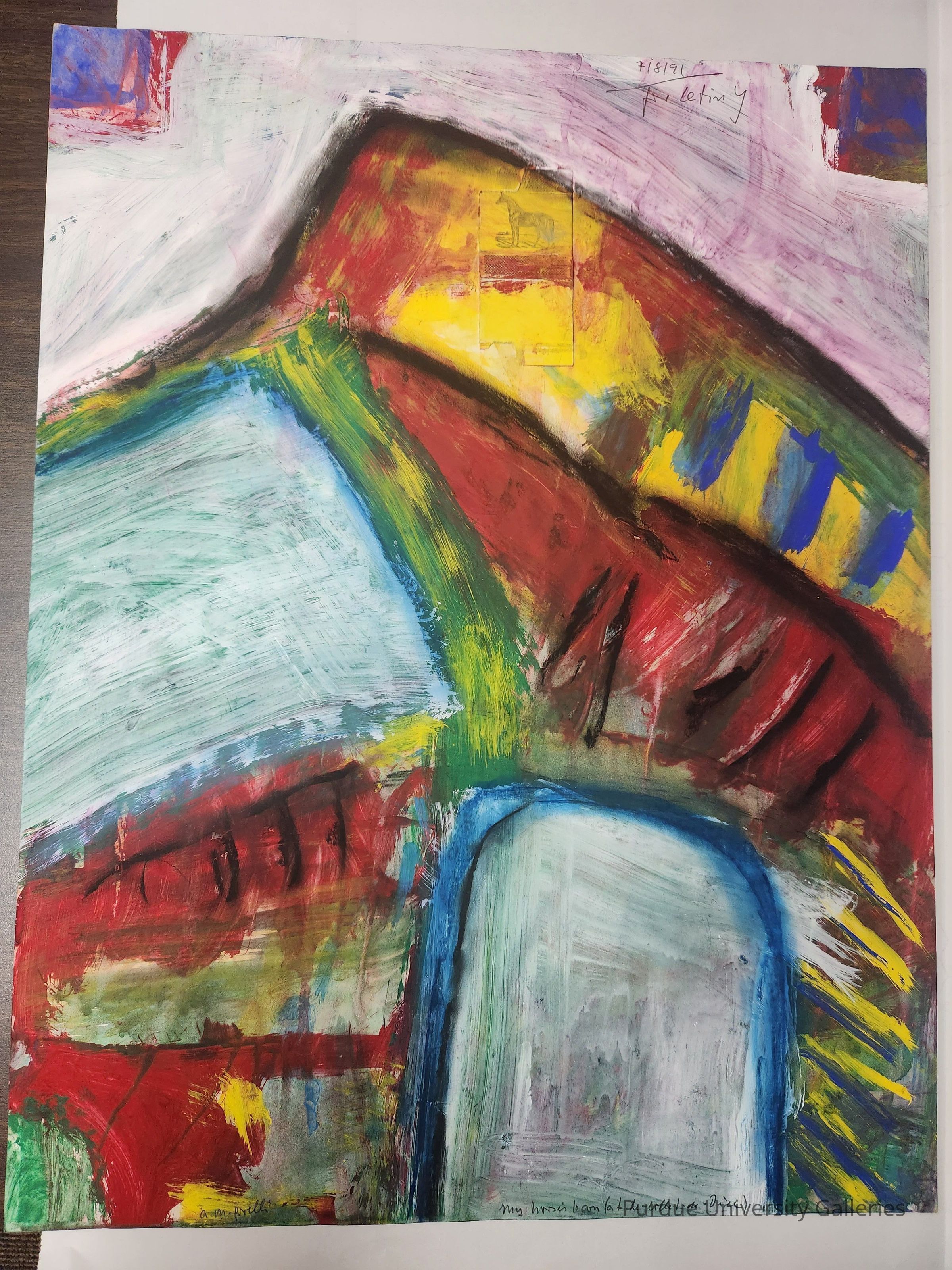 Abstracted color block painting with added image of a horse in upper half and text along the top and bottom.Type of Painting
