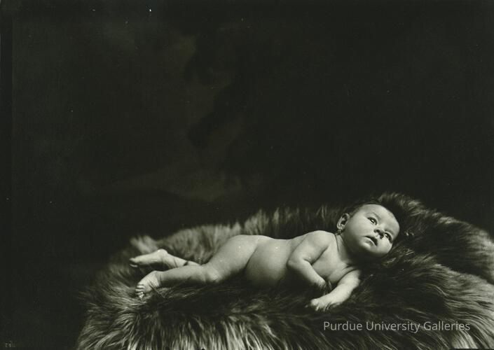 A image is a portrait of a nude baby laying on a fur covered surface. The subject is on the lower right corner while the rest of the image is blacked out. The baby is lying on its side while its head looks up and to the side, not looking at the camera.Photograph Details