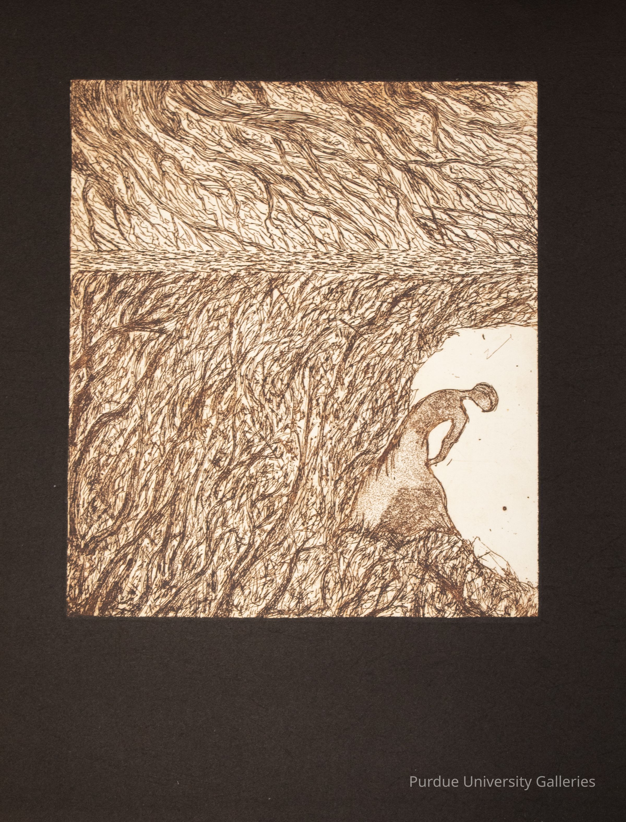 Print on cardstock of a human that seems to be either bound to the root system of the earth or purposefully walking through it. Print is brown on cream and is bordered in black. On the reverse printed in pencil from left to right "11/26," "Cemetary of the Innocent {20} (the next day and thereafter 8), artist's signature (illegible) 2016."Acquisition