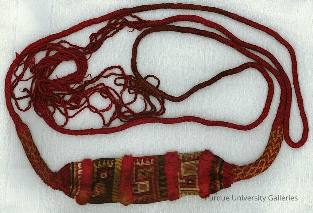 Fiber, alpaca. Ceremonial sling with tapestry and pile woven pouch and stylized bird motifs and braided cords. Colors include red, yellow, black, tan, and white. A fine example.Acquisition