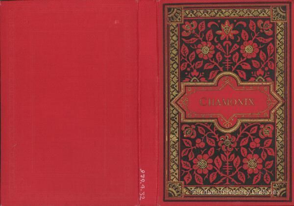 Photograph album w/ red cover, decorative front is red flowers on black background, flowers have gold centers and are encompassed by a gold and black border, center of cover is ribbon-type pattern with "CHAMONIX" in the center in gold on red background. Contains 12 cabinet cards.