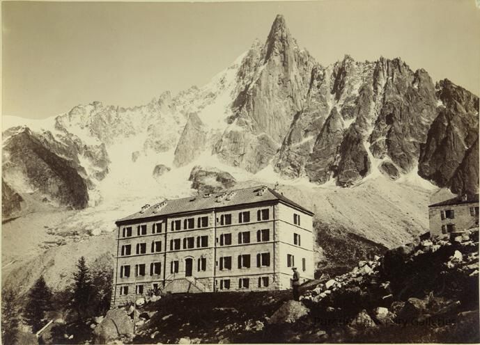 The photographer captures the Montanvert hotel with the French Alps in the background. The hotel is a simple four story building with a stairwell leading to the front door. The terrain aruond the hotel is rocky and steep as the hotel is built into the mountainous terrain. There is a man that is standing on the rocky terrain a little ways from the photographer and hotel. The hotel shows reference the large scale at which the mountains stand at. The mountains are jagged with narrow peaks, and a narrow ridge and snowy crevasse.Photograph Details