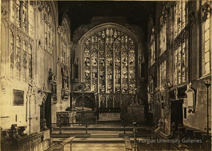 The image captures the inside of a church. The stained glass, above the alter, has an arch that reaches the ceiling. There are rows of stories and images depicted in the stain glass. The pews are lined up against the side as it lines the center that leads to the alter. The side walls are intact and also contain stain glass imagery. There are relief carvings in the wall throughout the church. There are also many sculptures of people throughout the church with a few on the alter, and a few on the side walls; most of the sculptures are portraits of the shoulder up.Photograph Details