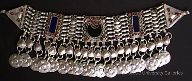 This choker bears reference to Islamic beliefs through the centrally located waning moon shape known to signify the Arabic Leagues, and through the alternating heart shapes seen linking the circles of silver dangling from the diadem. The heart shape is relative to the Arabic number “5” and is represented also through the five points of the Venus star which are said to represent the five pillars of Islam. The color usage also signifies the presence of Muslim beliefs in that green is said to be the color of “Allah”, and red being the reference to “blood shed” in historical jihad or “holy war”.
