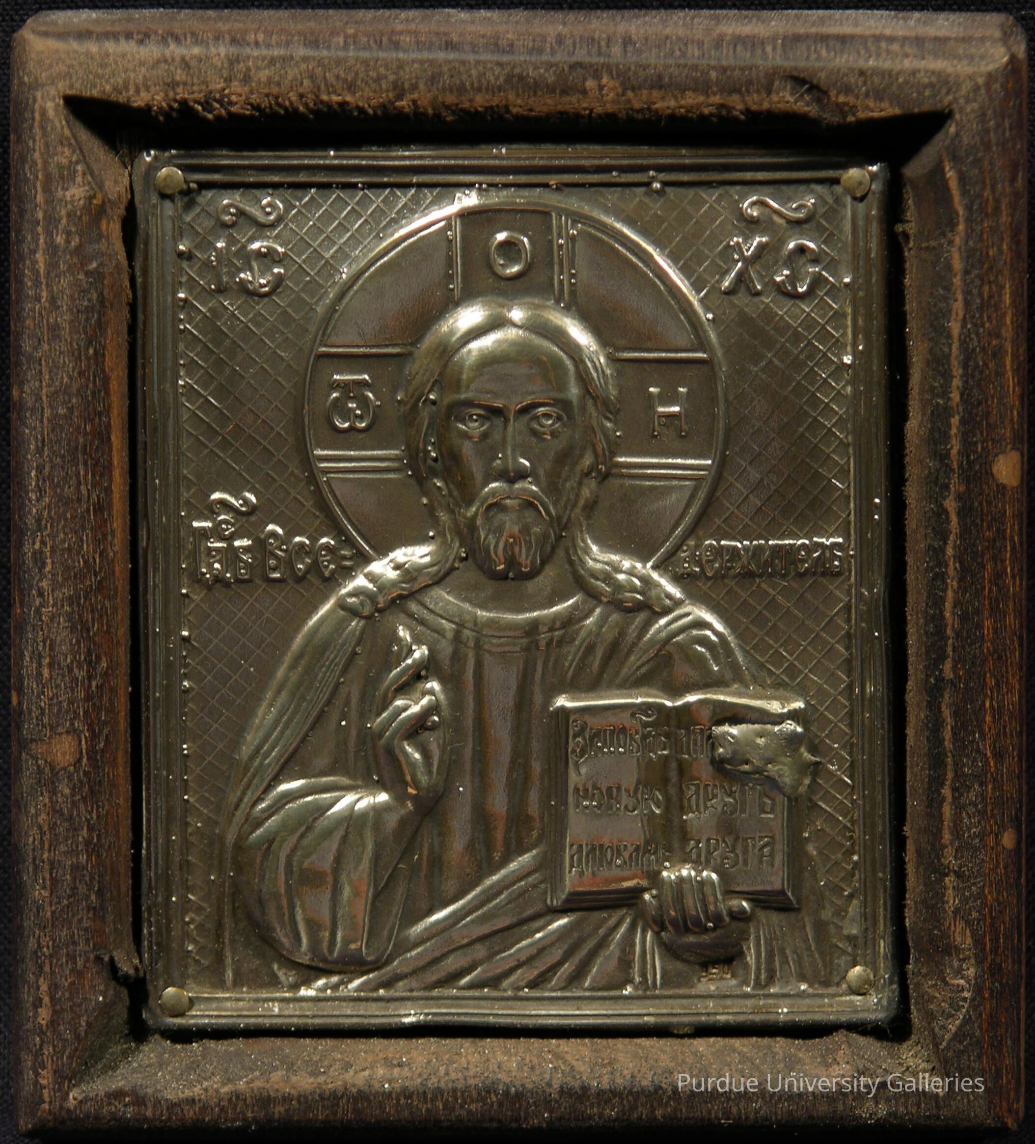 This icon depicts Christ Pantocrator in the “State Church” style, with the fingers of his right hand spelling out the Greek abbreviation of Christ’s name and his left hand holding the open New Testament. The imagery of the icon was created using the repoussé technique in metal