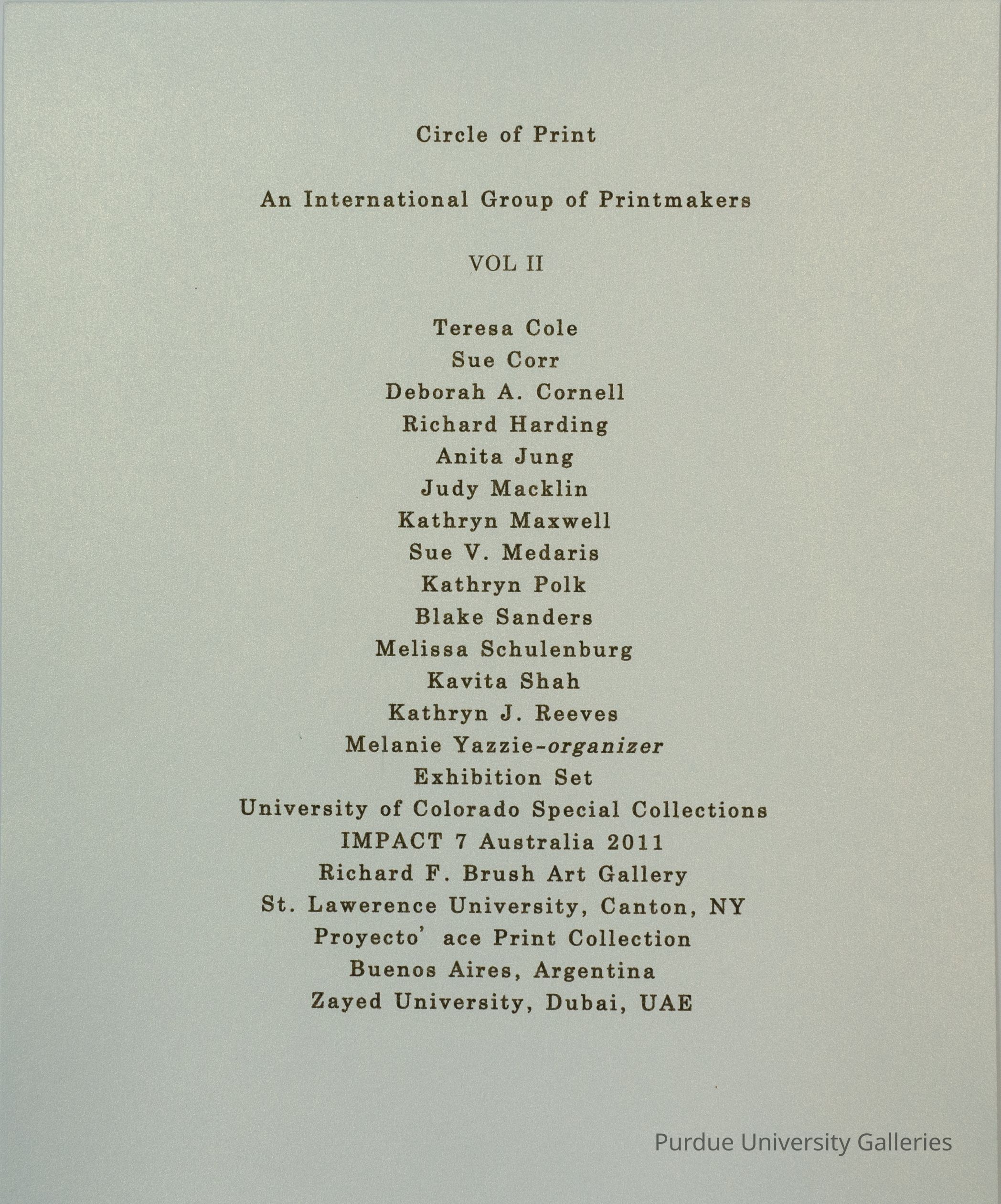 Text page with heading “Circle of Print: An International Group of Printmakers, Vol II”; list of 14 participants and the exhibition set; printed on textured, ivory paper with dark inkCollection