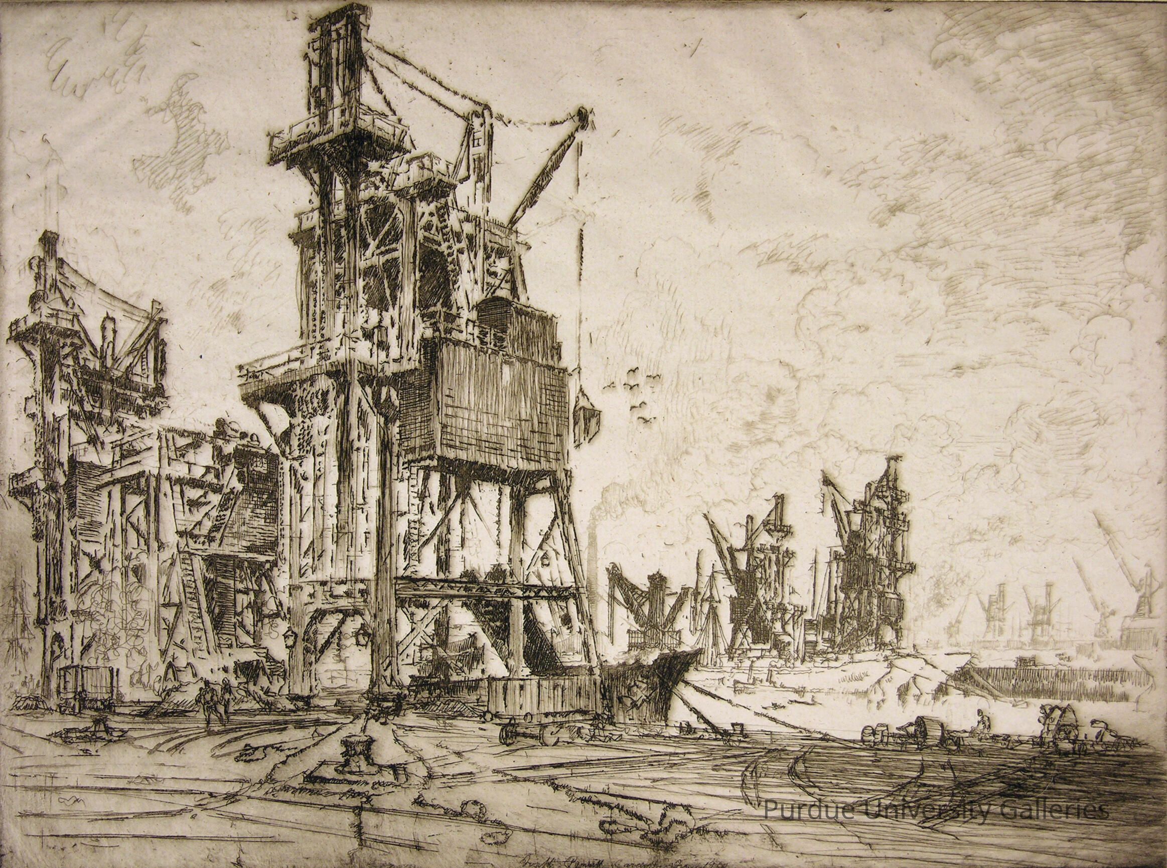 Coal at Cardiff is a drypoint etching. Cardiff is an island off the coast of Wales. Pennell uses hatching to create dark areas, and he also d eepens cuts into the copper plate to give a darker tone to the print. The foreground and background are clearly distinguished by the lighter and darker areas. Pennell also achieves depth by the use of linear perspective. The print is full of details of the mining and loading of coal at Cardiff, which was a major exporter at the time the print was made. The only open space, in the upper right area, is cleverly etched with the depiction of clouds and a few birds. The viewer can see smoke rising in the middle of the print. Pennell “re-popularized” prints and etchings in America. This print is typical of Pennell’s style and subject matter, making the landscape come alive. Pennell did not romanticize the scene but etched what he saw, an image that is truthful.