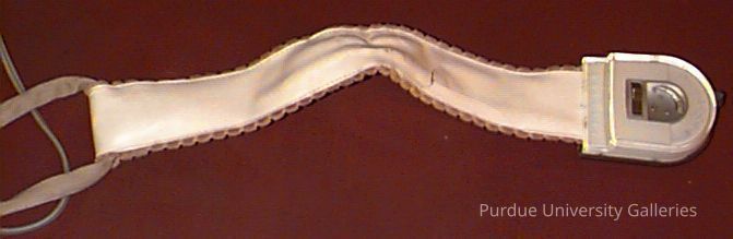 Long strip of fabric with electronic components on ends, including cord and control panel