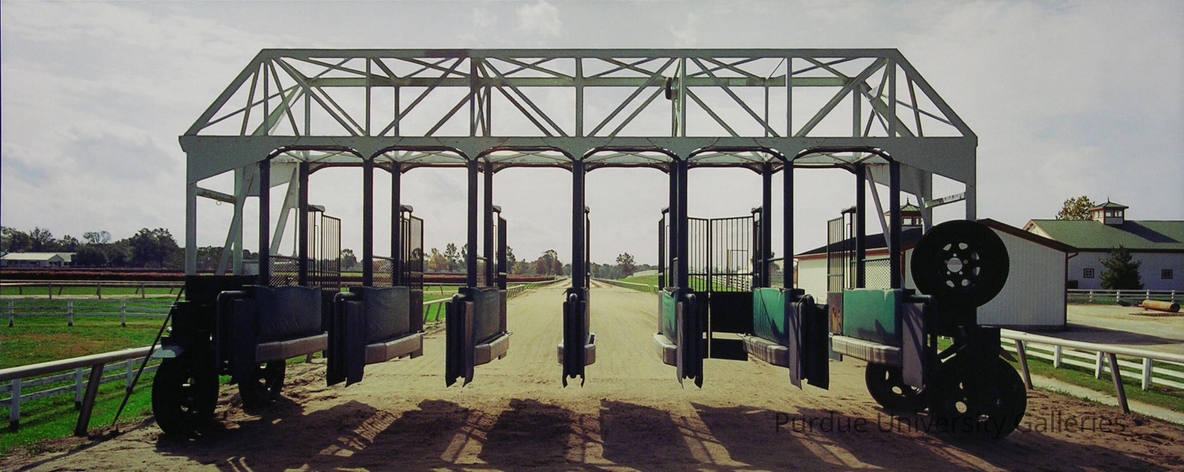 "Compression is a series of six photographs that resulted from visits by Ross to Kentucky during 2001 and 2002. They offer an interpretation of the Derby that immerses the viewer in a series of still moments leading up to the race, devoid of man or horse until the very last. The actual events of the race are implied between images, with the crowd seemingly waiting just out of frame. By compressing a period of months into tenths of a second, the photographer offers a quiet meditation on the annual event. "