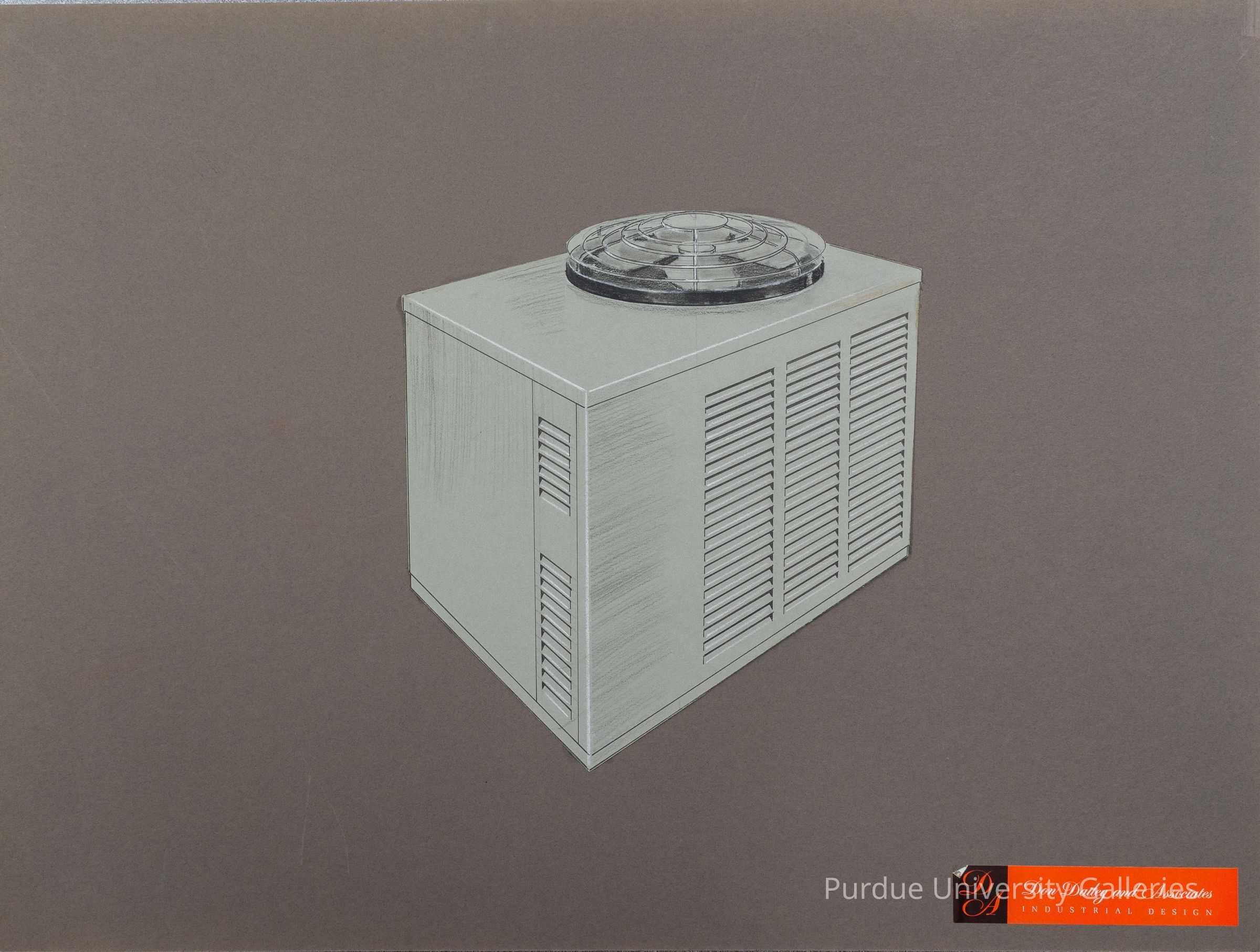A condenser unit (the outdoor portion of an air conditioner) prototype drawing. The drawing was cut out and pasted onto a brown piece of cardboard. There is an orange sticker on the bottom right-hand corner that says "Don Dailey and Associates" "INDUSTRIAL DESIGN". On the back side, there are many sketches and lines written in pencil.Artwork Details