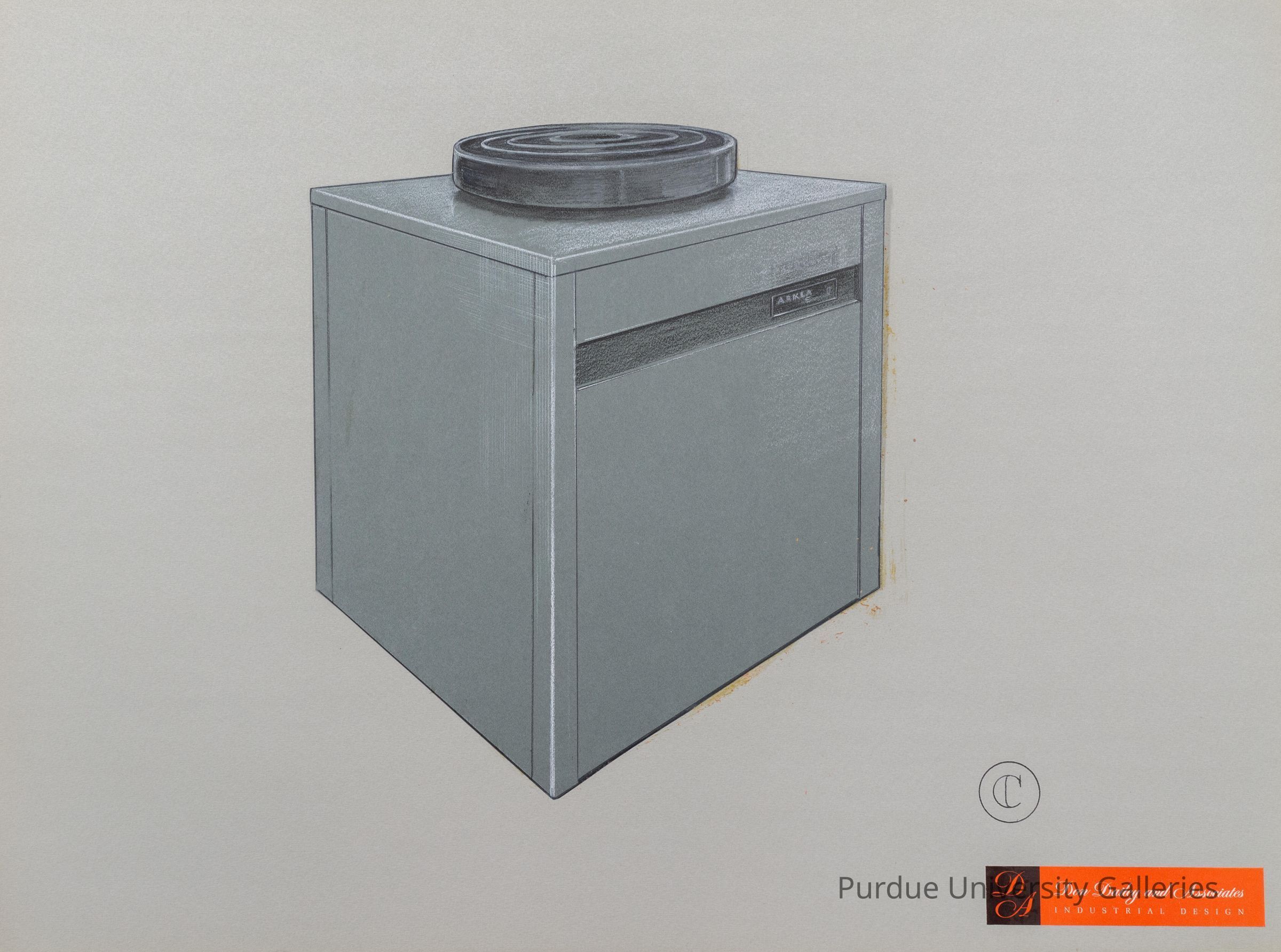 A condenser unit (the outdoor portion of an air conditioner) prototype drawing for ARKLA. The drawing was cut out and pasted onto a light-gray piece of cardboard. There is an orange sticker on the bottom right-hand corner that says "Don Dailey and Associates" "INDUSTRIAL DESIGN". Right above that is a "C" drawn with pen in the center of a circle.Artwork Details