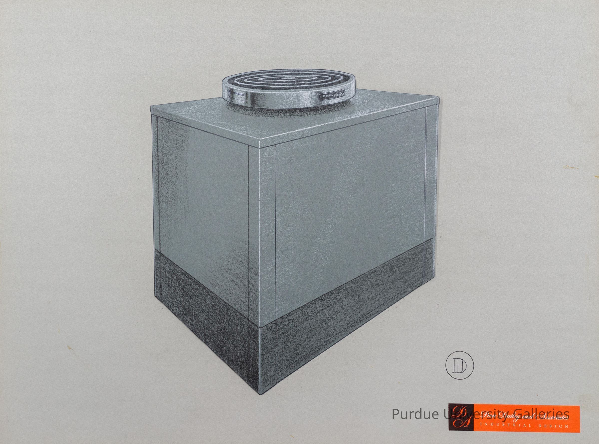 A condenser unit (the outdoor portion of an air conditioner) prototype drawing for ARKLA. The drawing was cut out and pasted onto a light-gray piece of cardboard. There is an orange sticker on the bottom right-hand corner that says "Don Dailey and Associates" "INDUSTRIAL DESIGN". Right above that is a "D" drawn with pen in the center of a circle.Artwork Details
