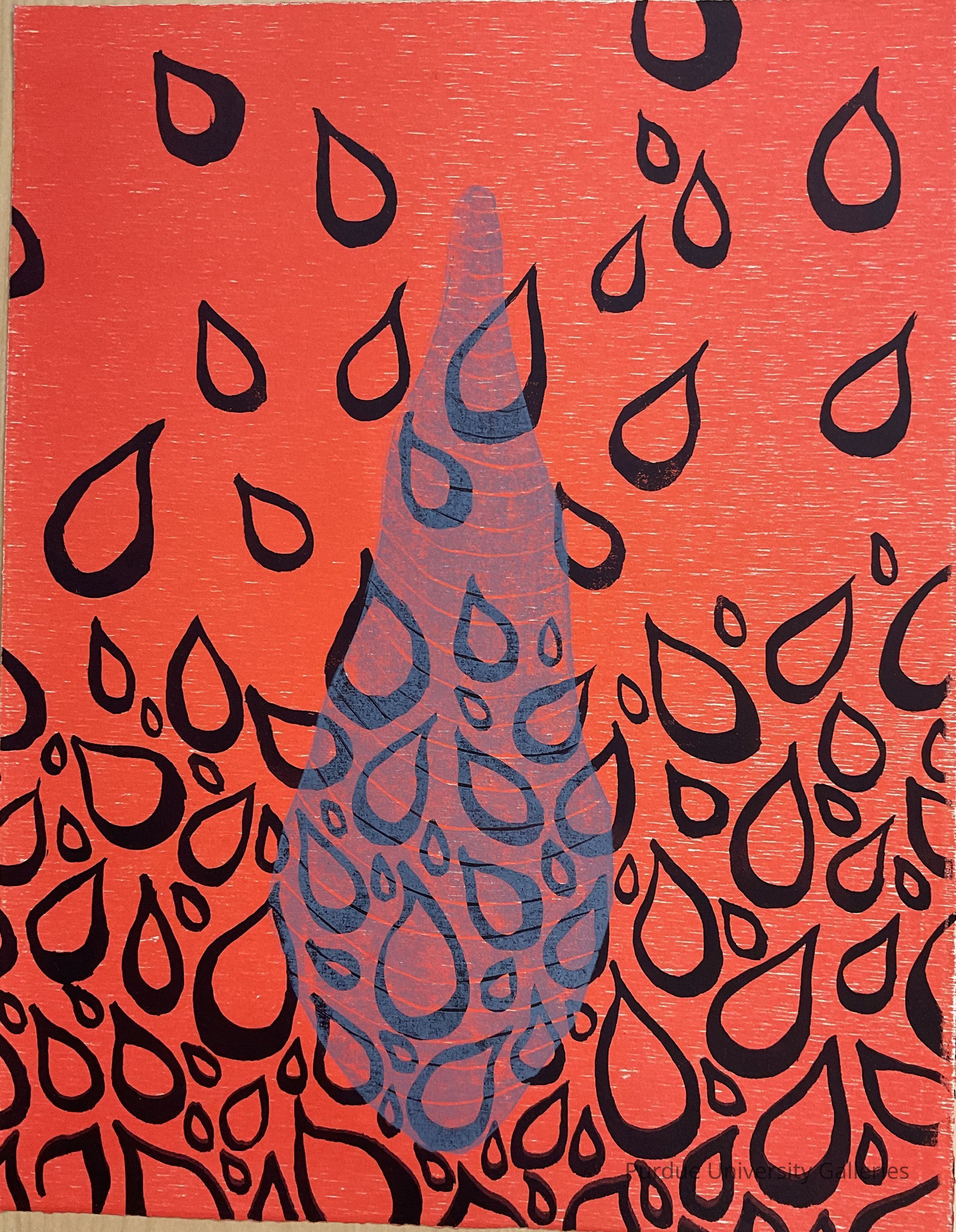 Print on heavy paper with red background, tear/rain drop-like figures in black throughout the work but concentrated at the bottom half. In the center is a bulb-like image in gray that is printed over the black tear/rain drops. On reverse at the bottom of the paper printed in pencil is "15/20, conflict, Eriko Fujita."