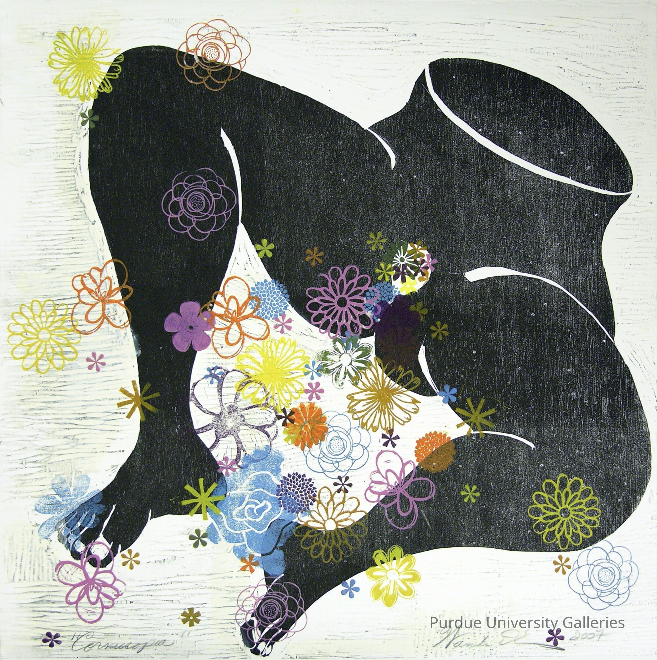 In Cornucopia Ewing renders the lower half of a black female birthing an abundance of flowers in bright Pop Art-esque colors, calling to mind Mother Nature or Mother Earth. Cornucopia is part of a larger series featuring the truncated bodies of black women in various poses and expressions. The series was inspired by Ewing’s chance encounter with a collection of antique porcelain half-dolls with impossibly tiny waists. Their forms spoke to Ewing’s own explorations of unrealistic female beauty standards and their effects and demands on black women’s bodies and hair.