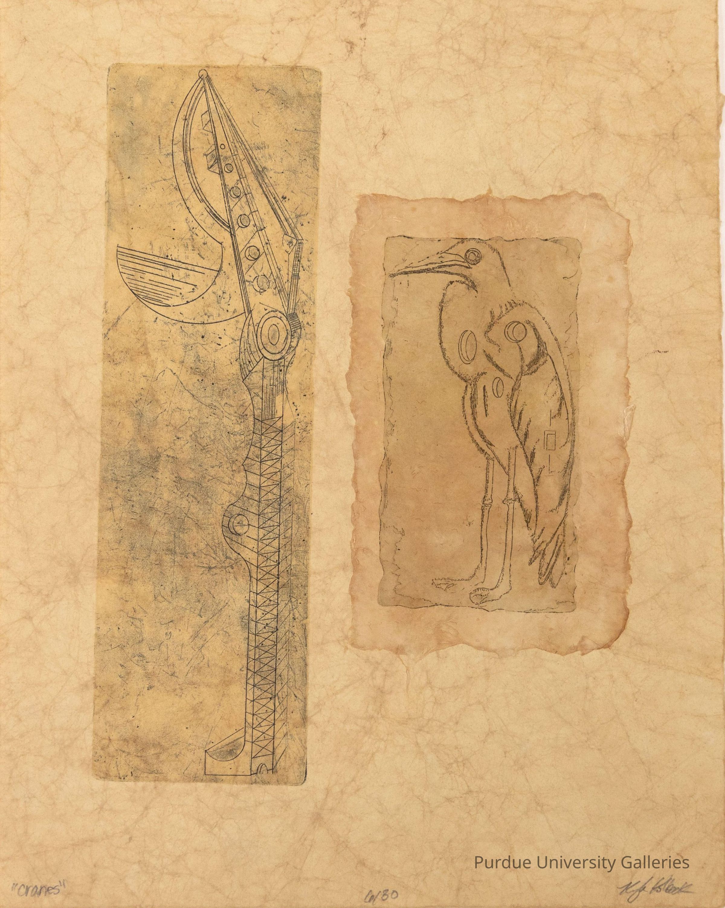 Two prints adhered to rag paper. The largest print is a stylized crane reminescent of one of the Alaskan tribes' totem poles. The smaller is of a crane standing. It appears to have holes in it's body and wings. It is also adhered to a second paper which is adhered to the main backing paper. The two drawings are parallel to one another and extend from top toward the bottom of the paper. Along the bottom of the main paper in pencil is "Cranes, 6/30, Kayla olbeck"Acquisition