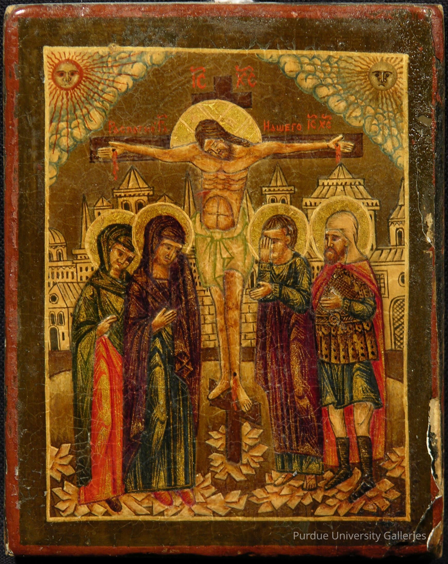 The Crucifixion is represented with Christ flanked by Mary Magdalene, the Virgin Mary, John the Apostle, and the centurion Longinus (cf. 2005.02.030). The sun and the moon appear in the upper left and right corners, and the city of Jerusalem (resembling a Russian city) appears behind the figures. The icon is executed in a provincial style with little attention given to careful modeling of the forms. The figures appear elongated and static as is common in Byzantine icons.