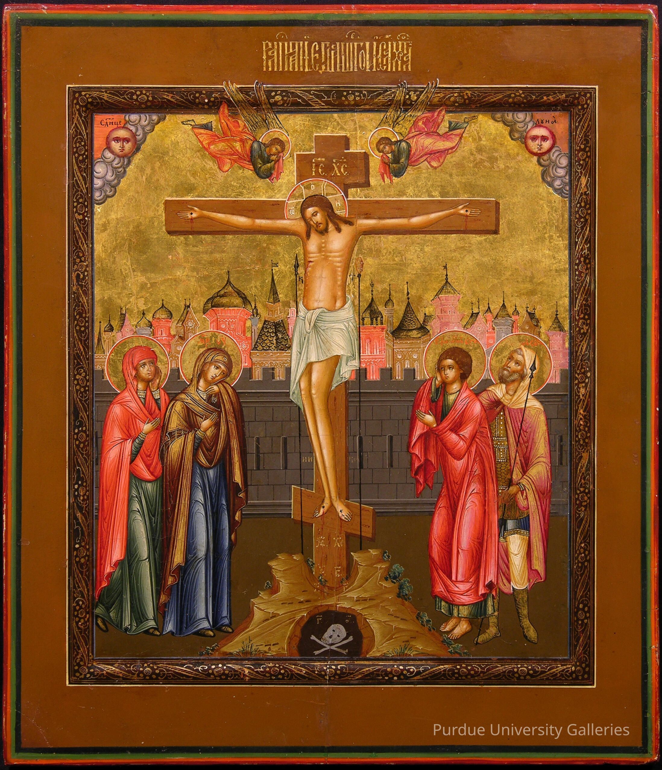 It is a traditional rendering of the Crucifixion at Golgotha, showing Christ on the Cross with eyes closed in a white loincloth surrounded by the Virgin and Mary Magdalene on his right and the Apostle John and Longinus, the Roman centurion who pierced Christ’s side with his lance on his left. Two weeping angels are stationed above the cross, which is in the Orthodox style and has additional horizontal wood pieces above Christ's head and at his feet. The instruments of the Passion appear within the scene: at Christ’s right is the spear and on his left is the sponge on a reed, used to give Christ vinegar when he asked for water. At the Lord’s feet appears the skull of Adam, said to have been exposed by an earthquake during the Crucifixion. In the upper left and right corners are the sun (which has darkened) and the moon (which has become bloody). In typical Byzantine fashion, the background and figures’ haloes are painted in gold. The crucifixion takes place before a grey-black brick wall with onion dome buildings behind it in red, brown, pink, and blue.