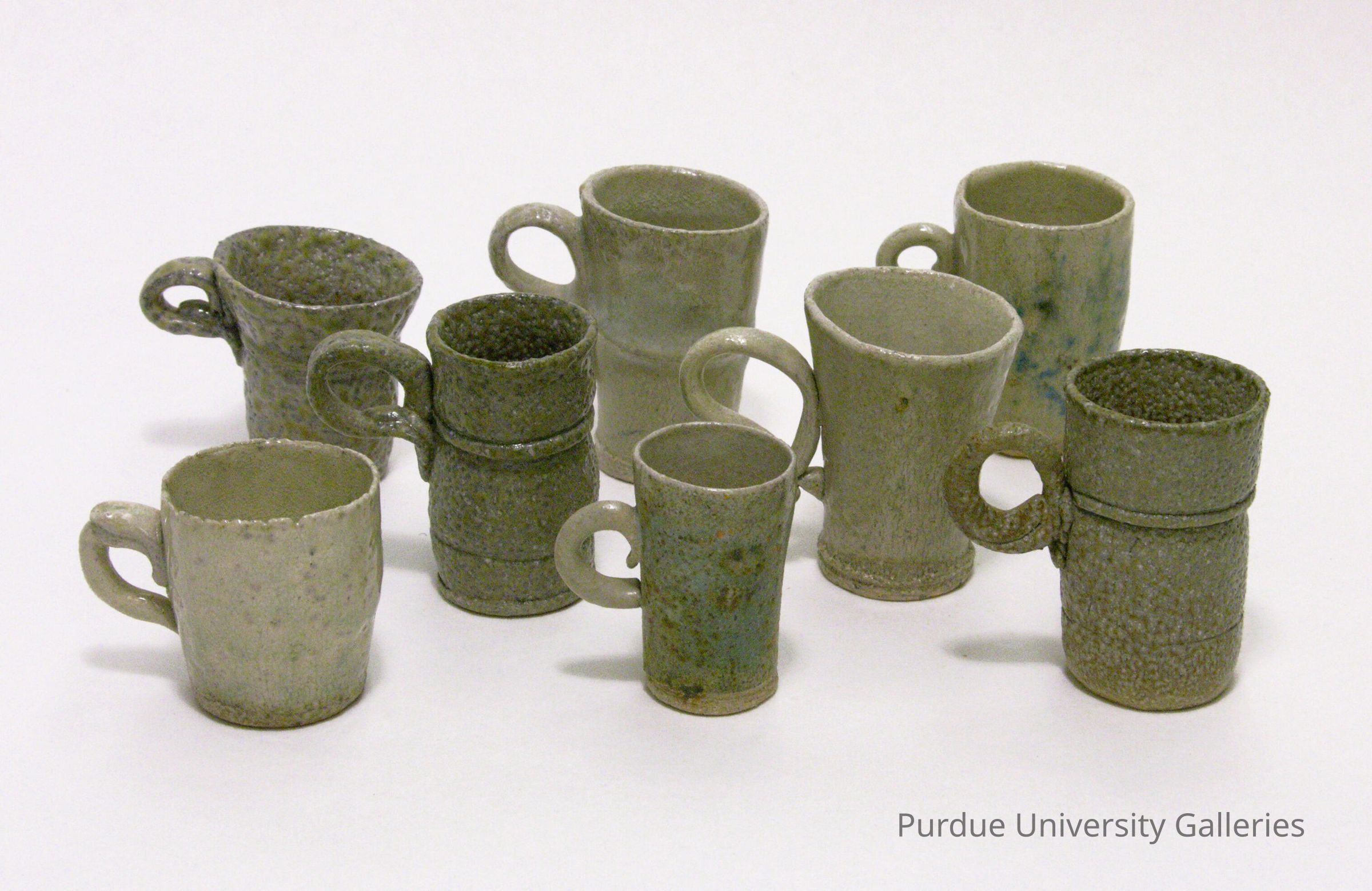 This collection stands at 8 ceramic mugs that look similar to each other. They all vary in height and thickness. Some have ridges and others have none. While no body is the exact same, they all match as a collection together due to their cohesive glaze and silhouette. These appear to be made from the wheel and the handle hand built. The color of the glaze is a grey speckle with slight colors peeking through each mug uniquely.Type of Sculpture