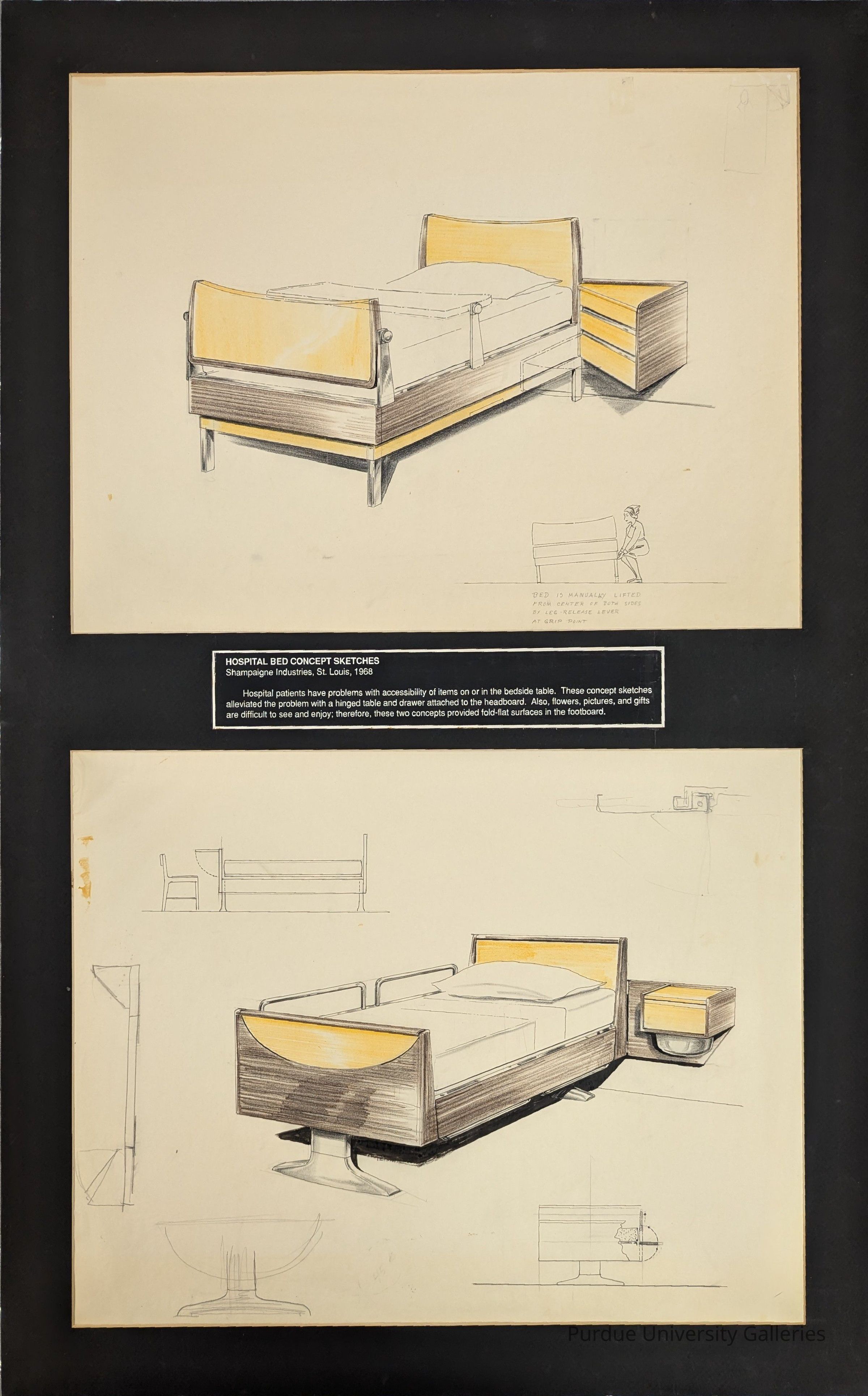 Hospital patients have problems with accessibility of items on or in the bedside table. These concept sketches alleviated the problem with a hinged table and drawer attached to the headboard. Also, flowers, pictures, and gifts are difficult to see and enjoy; therefore, these two concepts provided fold-flat surfaces in the footboard."Collection