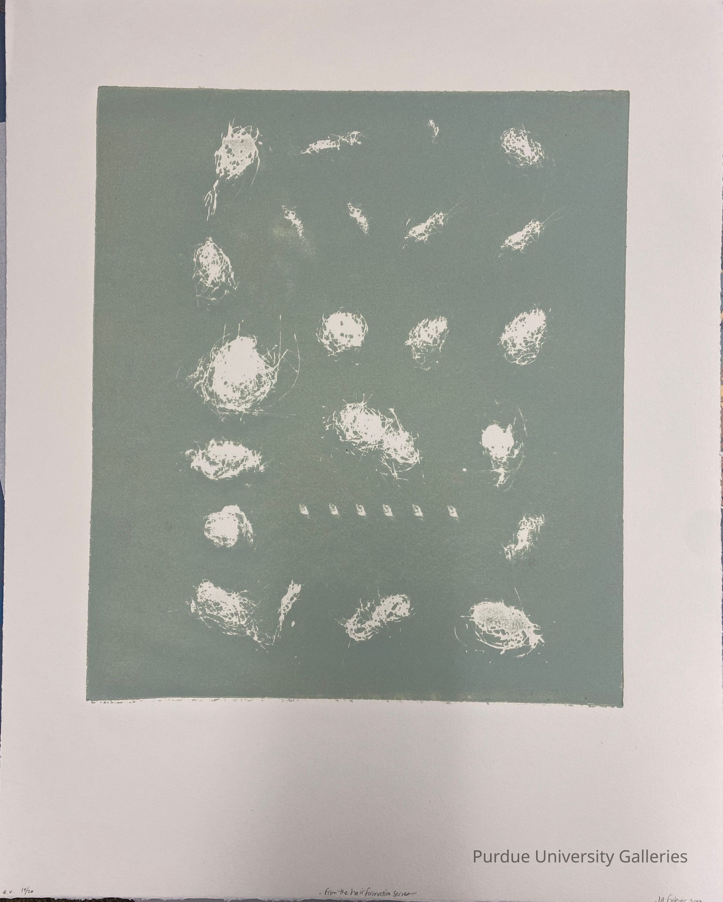 Irregular white shapes in rows (meant to be balls of hair) on a mint green backgroundType of Print
