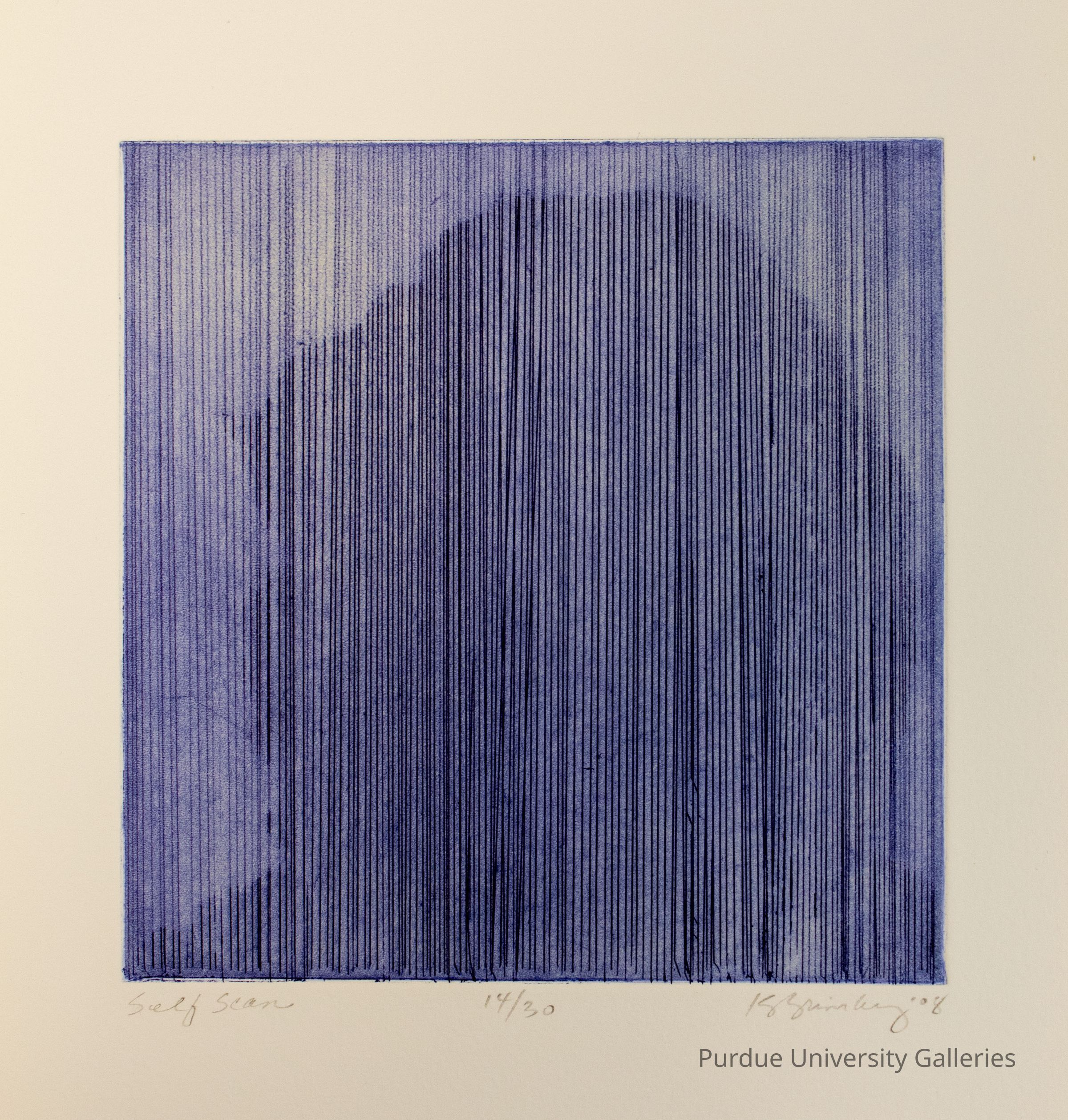 8" x 10" cardstock with shadow of head in lines of shades of blue. Below image printed in pencil from left corner to right is "Self Scan," "14/20," "K. Brimberry '08"