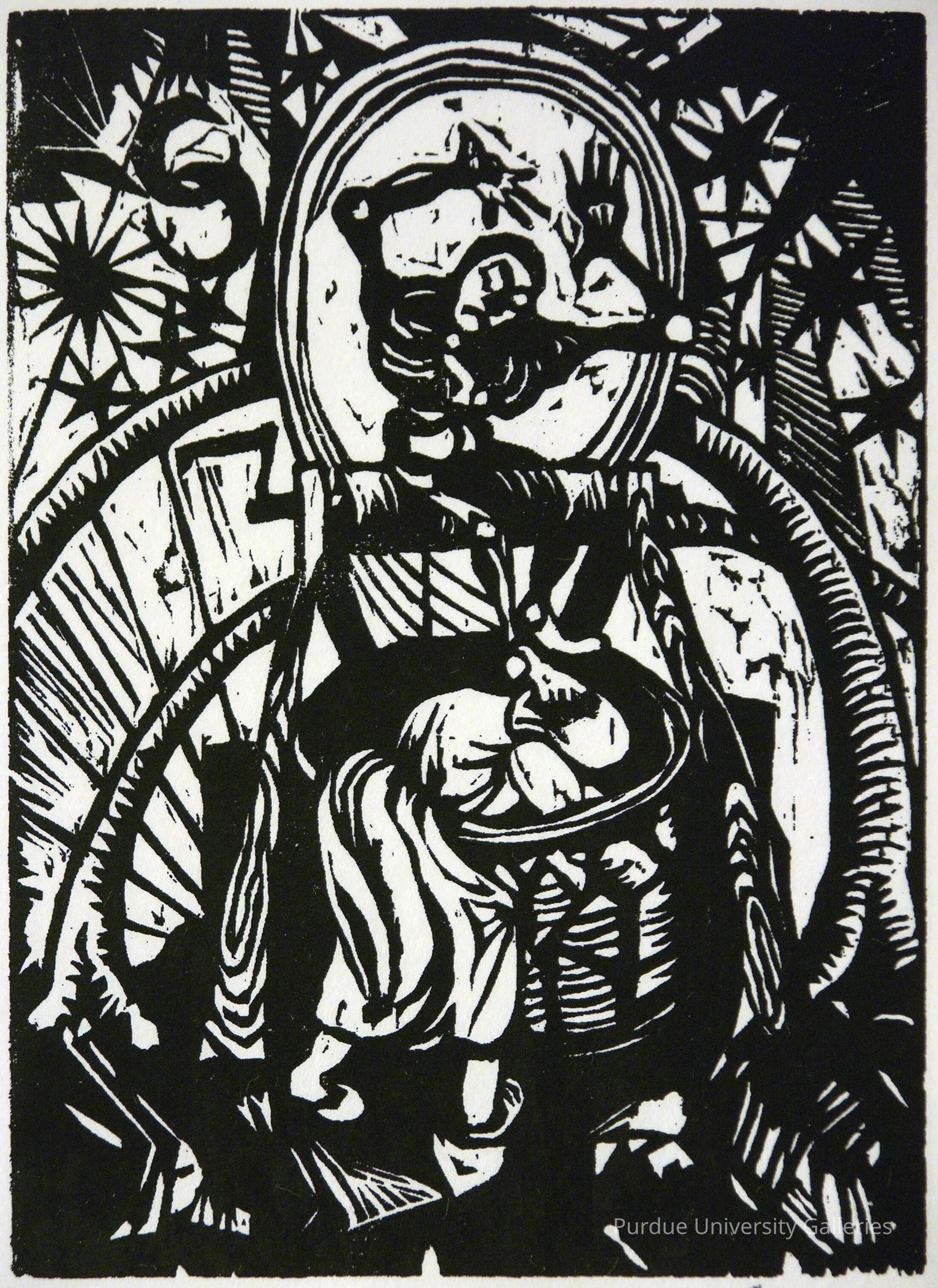 Woodcut with black ink. Figure in the middle and organic shapes in the figure and around the border.
