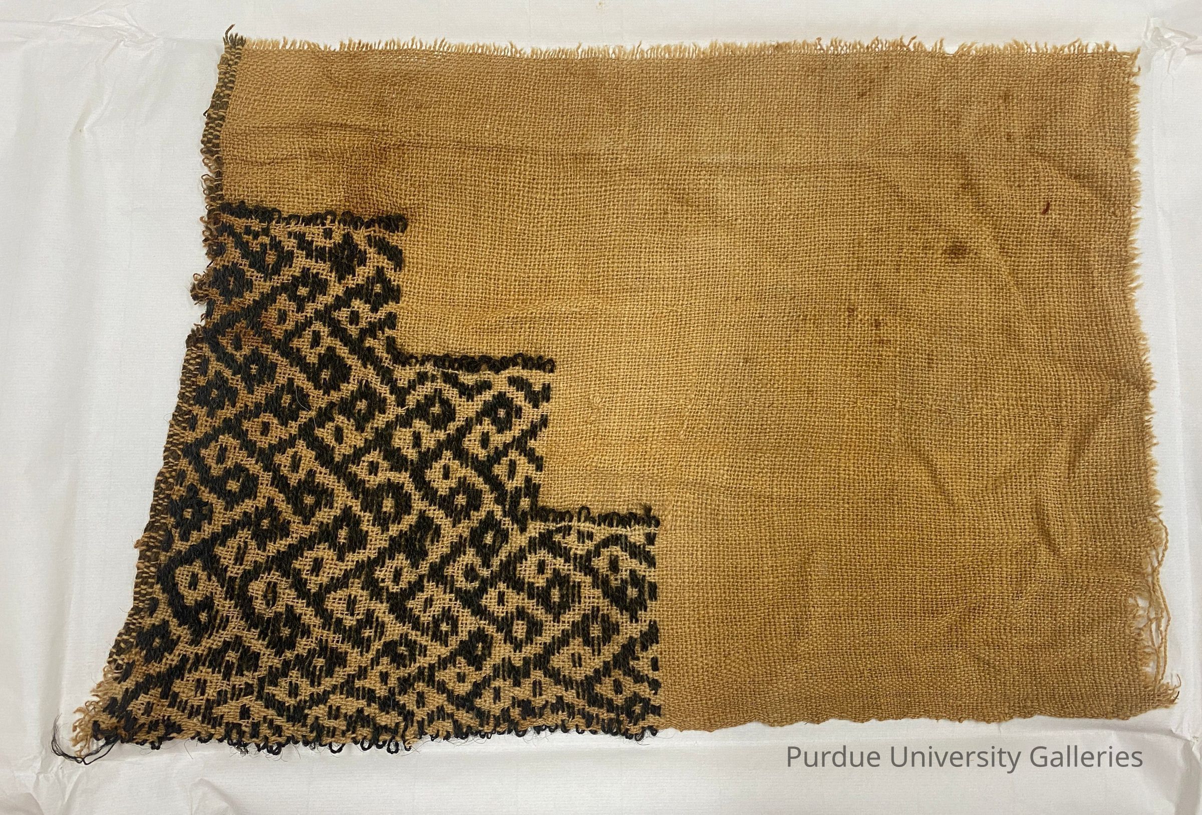 Fiber, alpaca, and cotton. Woven decorative corner for plain weave garment with stylized corn motif in supplementary weft technique. Colors include brown and tan.Acquisition