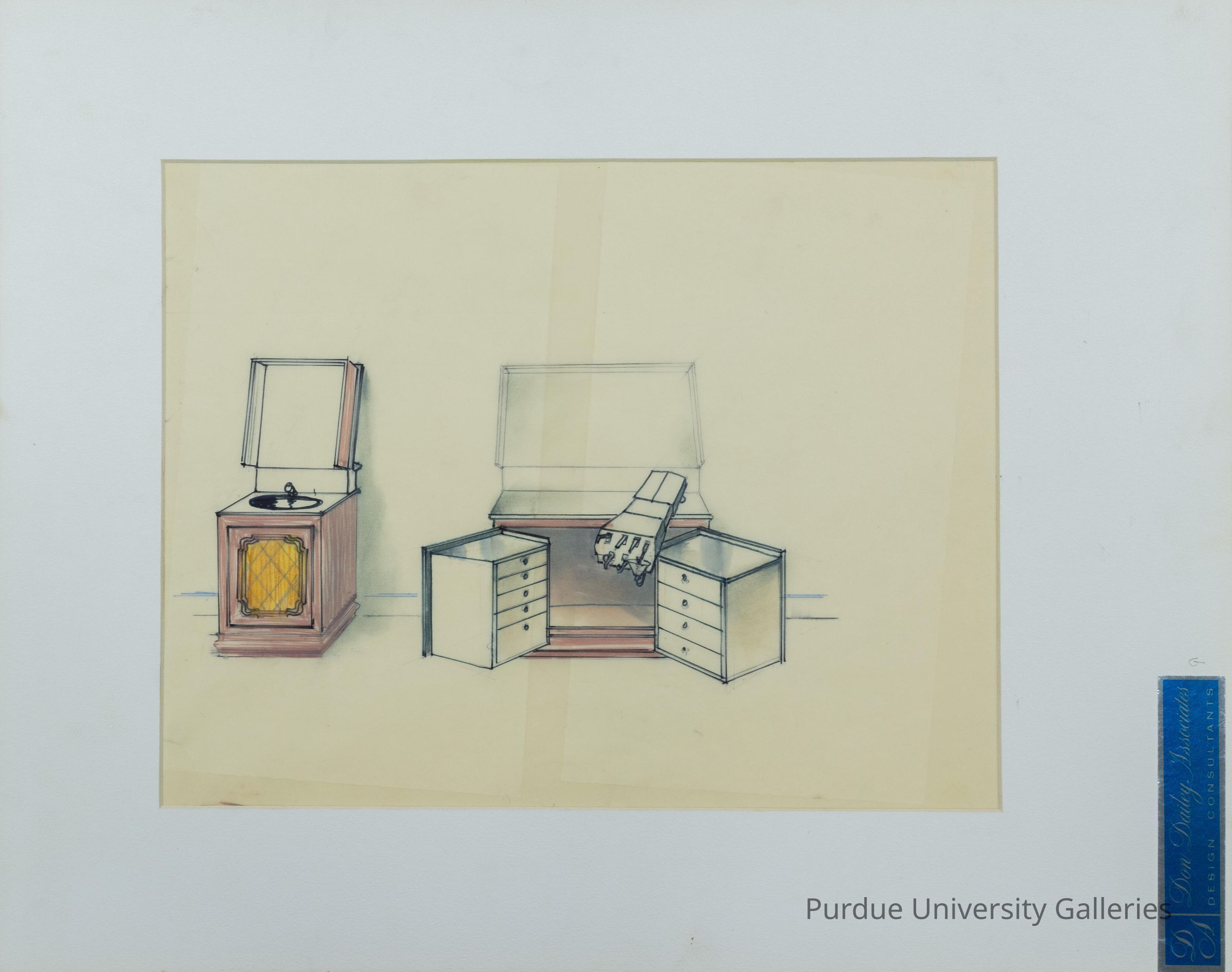 Prototype drawing of two dentist office cabinets. One cabinet opens up at the top to use the sink underneath. The other has an arm to hold dentist equipment and doors with drawers on the inside. "DDA 6 -'73" is written in black on the bottom, right-hand corner of the drawing. "G" is written in pencil on the right-hand side of the frame, just above a blue and silver sticker that says "Don Dailey Associates" "DESIGN CONSULTANTS".Type of Drawing